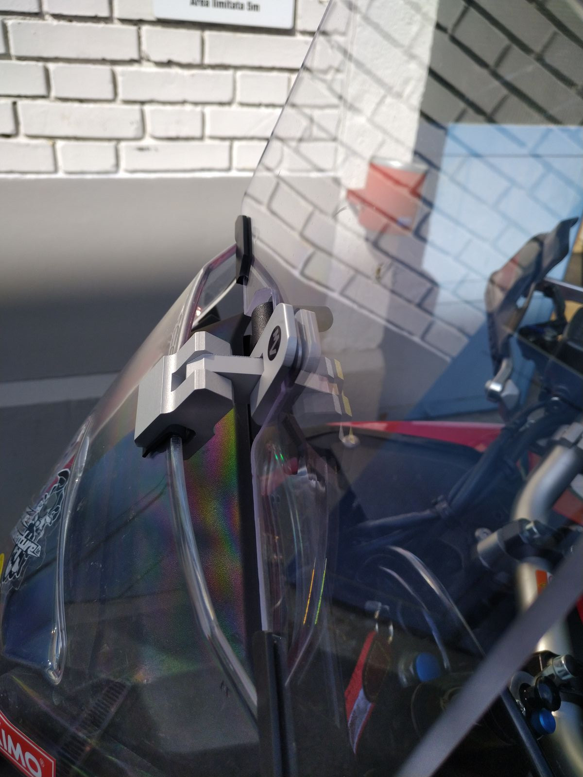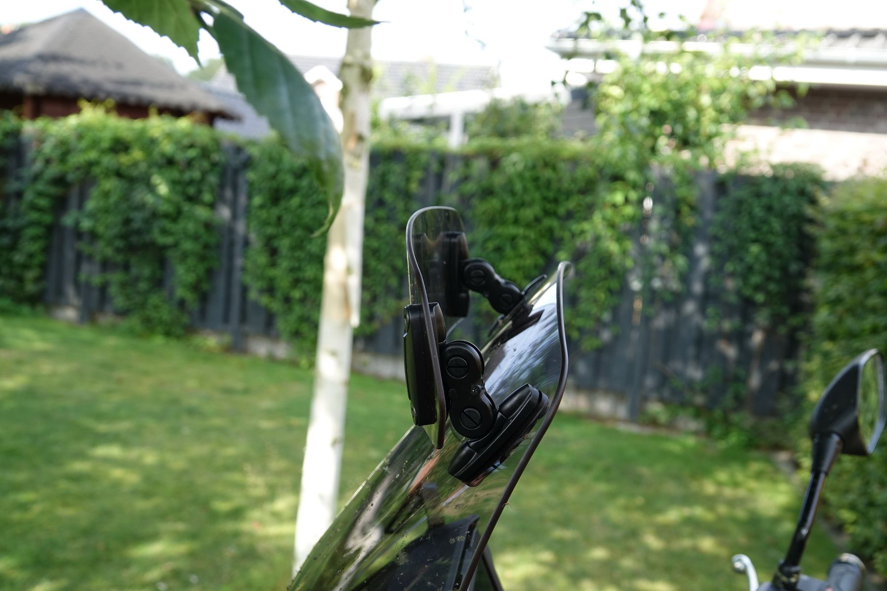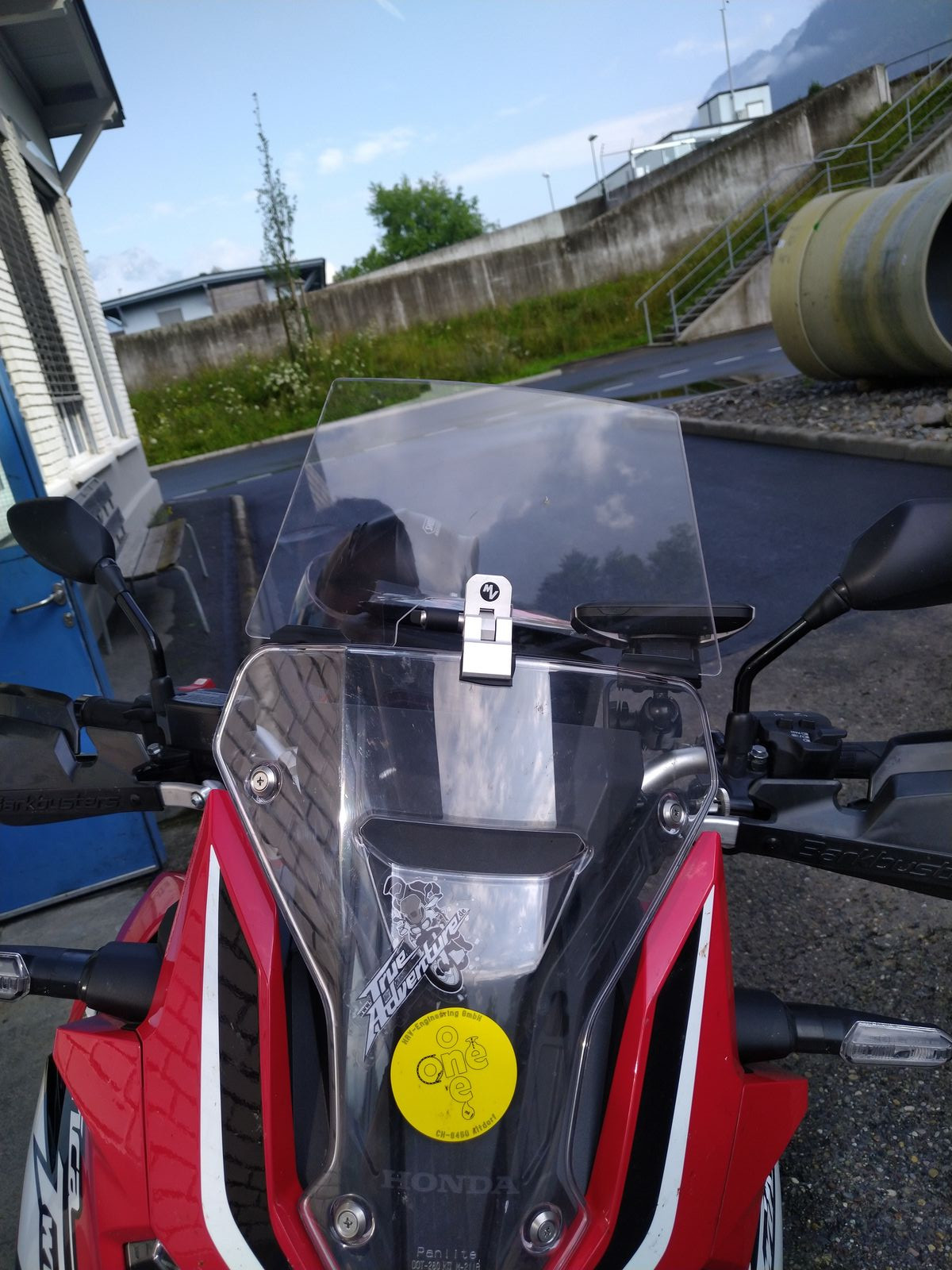 Der Aufsatz stützt sich auf der Originalscheibe ab. Erstaunlich stabil - als müsste es genau so sein. Mit dem Anstellwinkel hab ich während der Fahrt gespielt. In Flucht zur Originalscheibe hat sich am besten bewährt.
