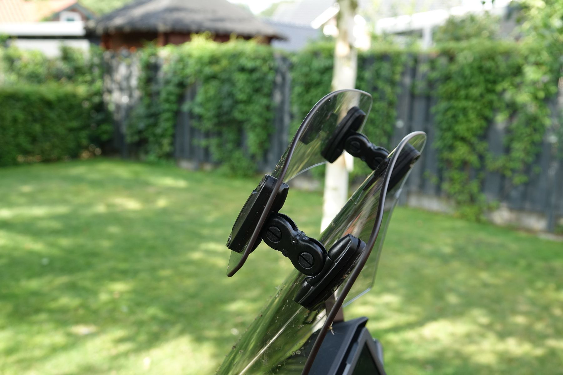 Die große Scheibe kann während der Fahrt in der Höhe verstellt werden (so 3cm). Es gibt also einen eigenen Scheibenhalter aus Metall. Die kleine Scheibe kann 5-fach in der Höher verstellt werden und 3-fach im Winkel. In der Werbung stand das nicht.