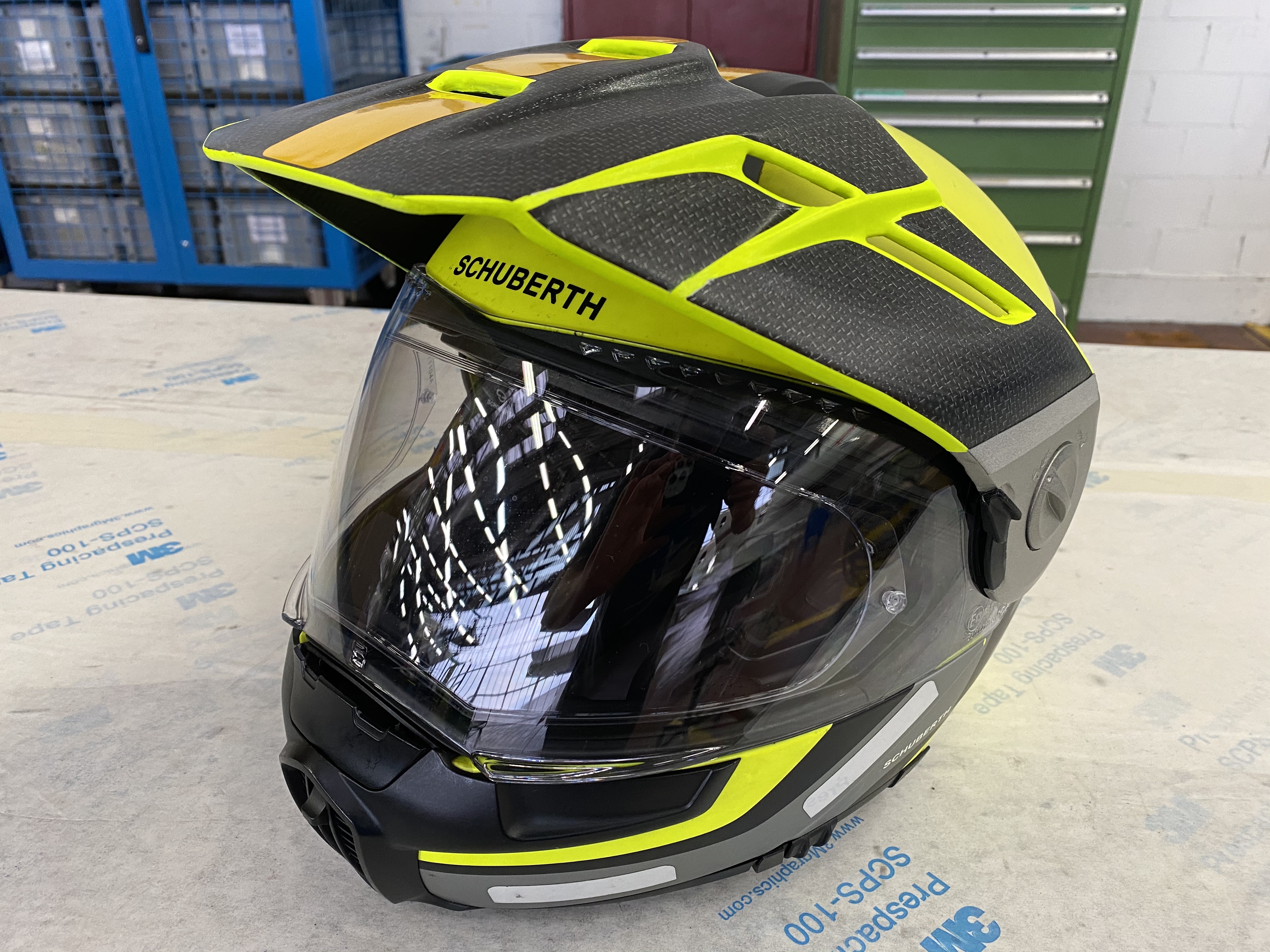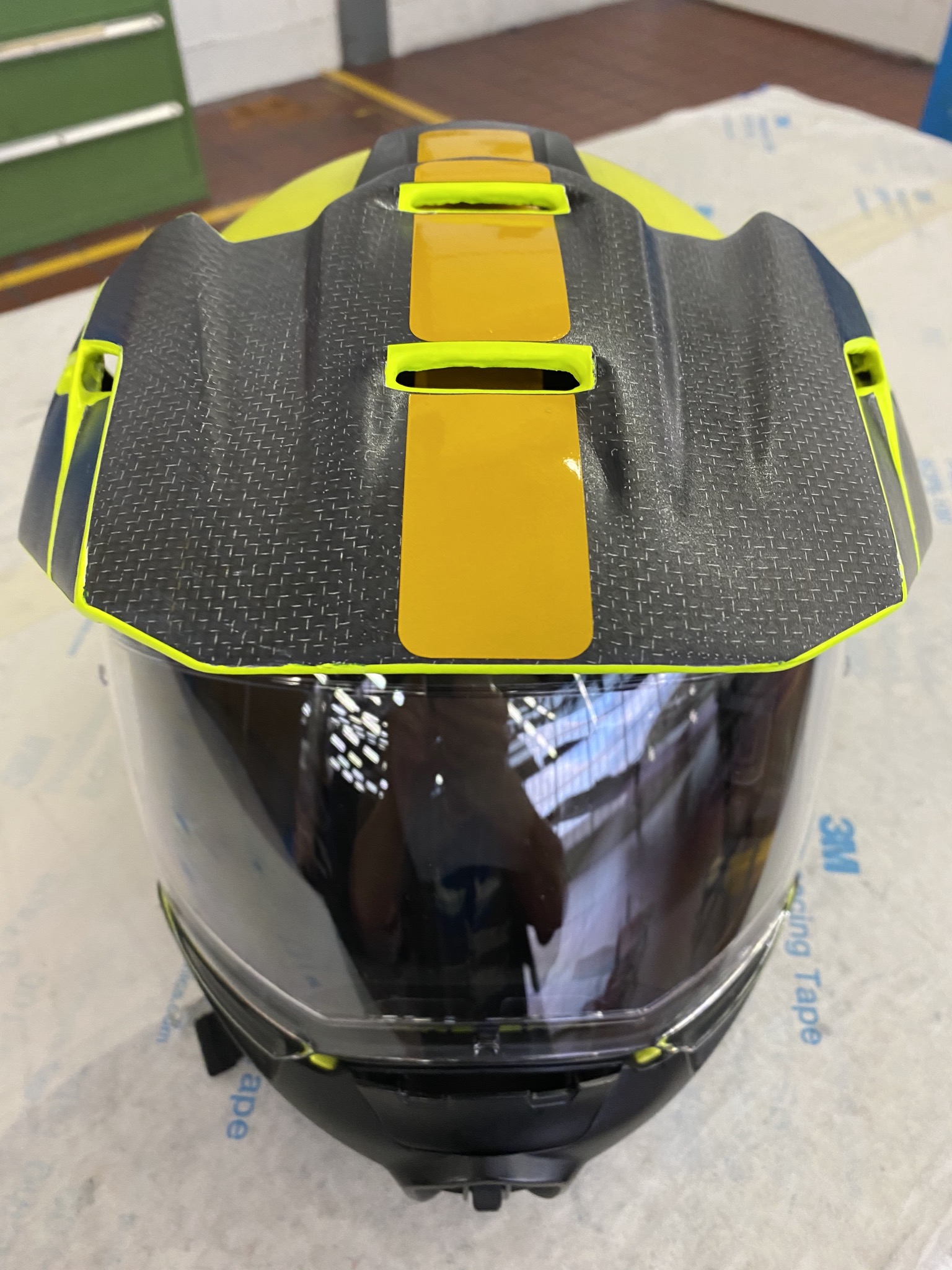 Nach einer halben Ewigkeit ist es nun vollbracht. Die leidigen Vibrationen am Helmschild meines Schuberth E1 gehören endlich der Vergangenheit an. Dazu waren allerdings einige Lagen Carbongewebe von Nöten. Deren drei befinden sich nun als Verstärkung auf der Unterseite, sowie eine auf der Oberseite. Wer genau hinschaut wird erkennen, daß es sich um kein handelsübliches Material handelt. Ins Gewebe ist ein LSP-Mesh (Aluminiumnetz) eingearbeitet. Dieses dient in erster Linie dem Blitzschutz von Flugzeugkomponenten, aber auch als Splitterschutz im Falle einer Überbelastung (z. B. beim Aufschlagen auf dem Boden).