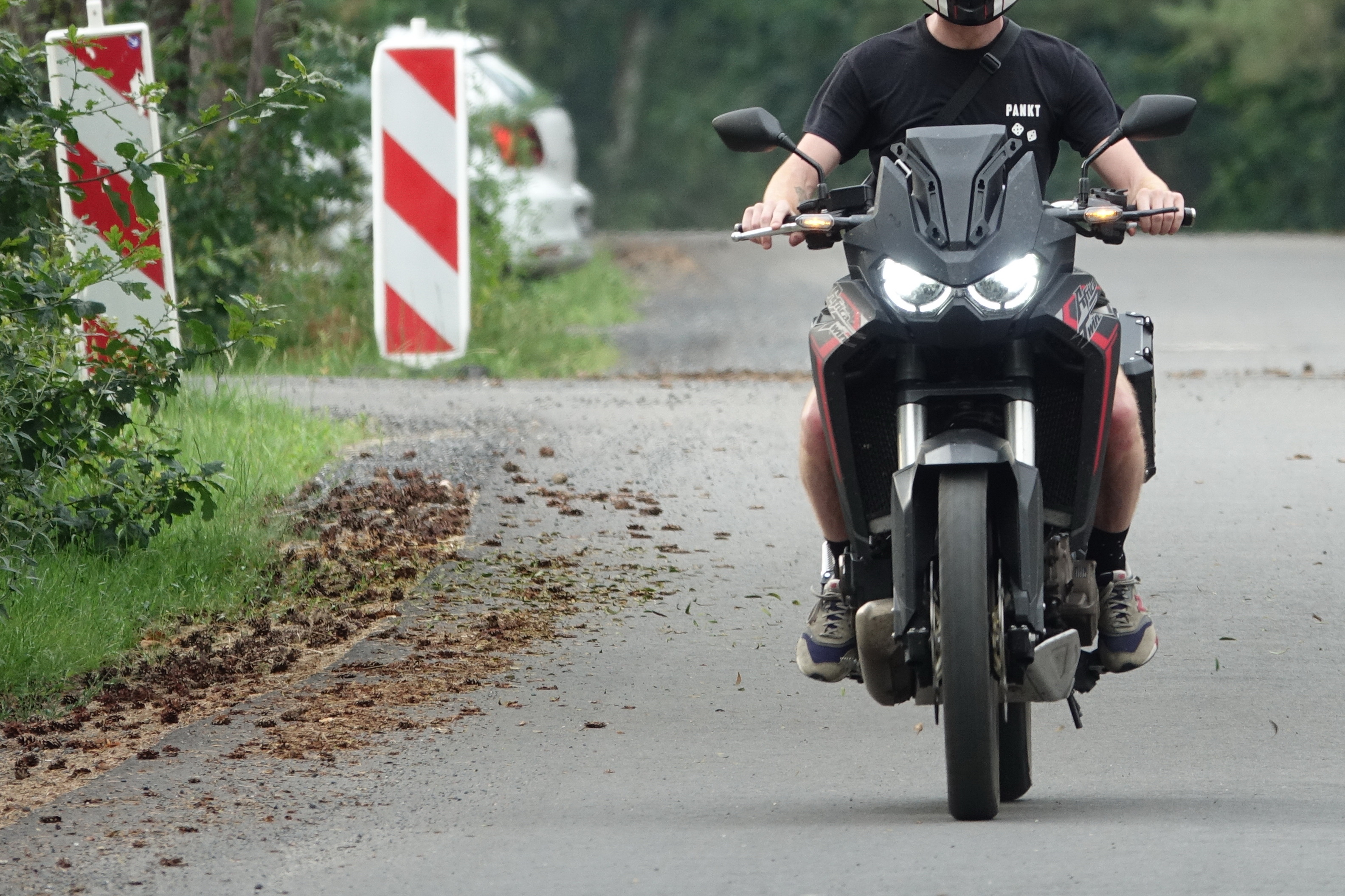 Die halben Handschützer der CRF1100 habe ich relativ schnell demontiert, dann noch einmal probeweise montiert und dann wieder demontiert. Ohne gefällt mir die Handhabung besser. Sowohl beim Schieben als auch beim Fahren. Optisch mag ich es so auch lieber. Man kann auch beim Beladen etwas an den Lenker hängen. Die polierten Ringe die ich dafür benötigte hatte ich zufällig. Ich glaube sie stammen aus einer Festplatte.