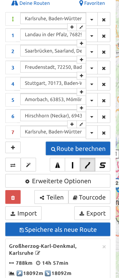 Biete Start Ka Baden (BaWü), Landau Pfalz, ( Frankreich Elsass Mergez möglich) Saarbrücken Saarland, Freudenstadt BaWü Schwarzwald, Stgt BaWü Schwaben, Amorbach Bayern, Hessen Hirschhorn. Ziel wieder KA ergibt 5 Bundesländer 7 Regionen 7 Würste. Tour etwas optimiert 695 KM