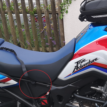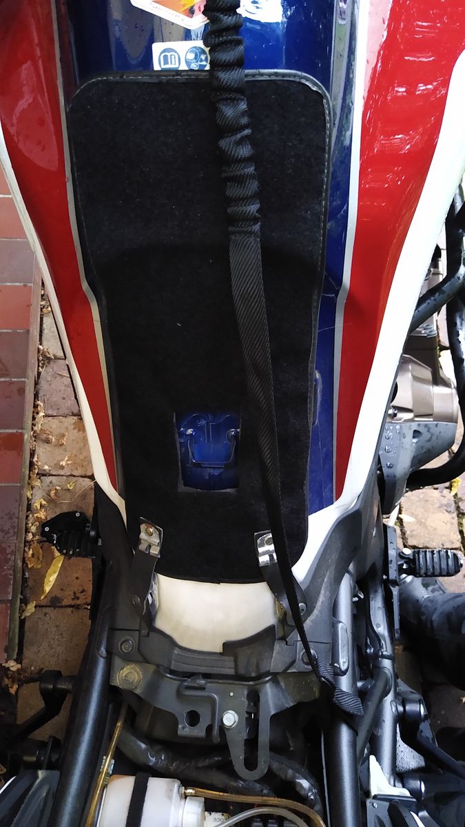 Unter der Sitzbank bliebe nur die Strebe übrig, wo die Sitzbank vorne eingeschoben wird. Versuchsweise habe ich dort einen baugleichen Riemen befestigt. Der Effekt ließ nicht lange auf sich warten, die Sitzbank bekomme ich so nicht in die Halterung geschoben. Entweder bin ich zu bl.d oder zu ungeschickt.