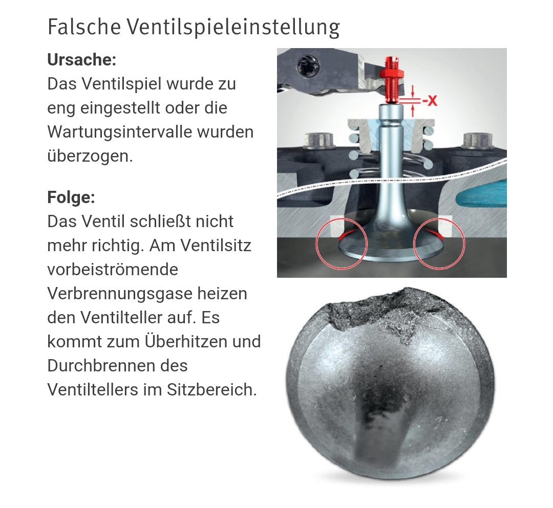 Ich hab mich damals mit meiner letzten Maschine mit dem Ventilspiel intensiv außeinandergesetzt, eine Triumph Street Triple R von 2013, auch hier ist selten das Spiel nachzustellen, jedenfalls was ich so in den Foren gelesen habe. Aus dem Grund habe ich auch mit dem Gedanken gespielt das vielleicht sein zu lassen. Mich dann ein bischen eingelen und informiert, und da hieß es dass wenn ein Ventil nicht mehr ganz schließt, also keinen vollflächigen Kontakt zum Ventilsitz hat, die Temperatur aus dem Ventil nicht mehr so abgegeben werden kann wie es sollte --> Ventil wird im Dauerbetrieb einfach zu heiß, gerade eben bei Motorradmotoren mit höheren Drehzahlen. Das Ergebnis kann von leichten Verbrennungen am Ventil (wohl egal) bis zum Ventilabriss alles sein. Bei den neueren Street Triple Motoren mit 765ccm liest man zur Zeit immer öfters von Ventilabrissen, evtl. ein Zusammenhang?