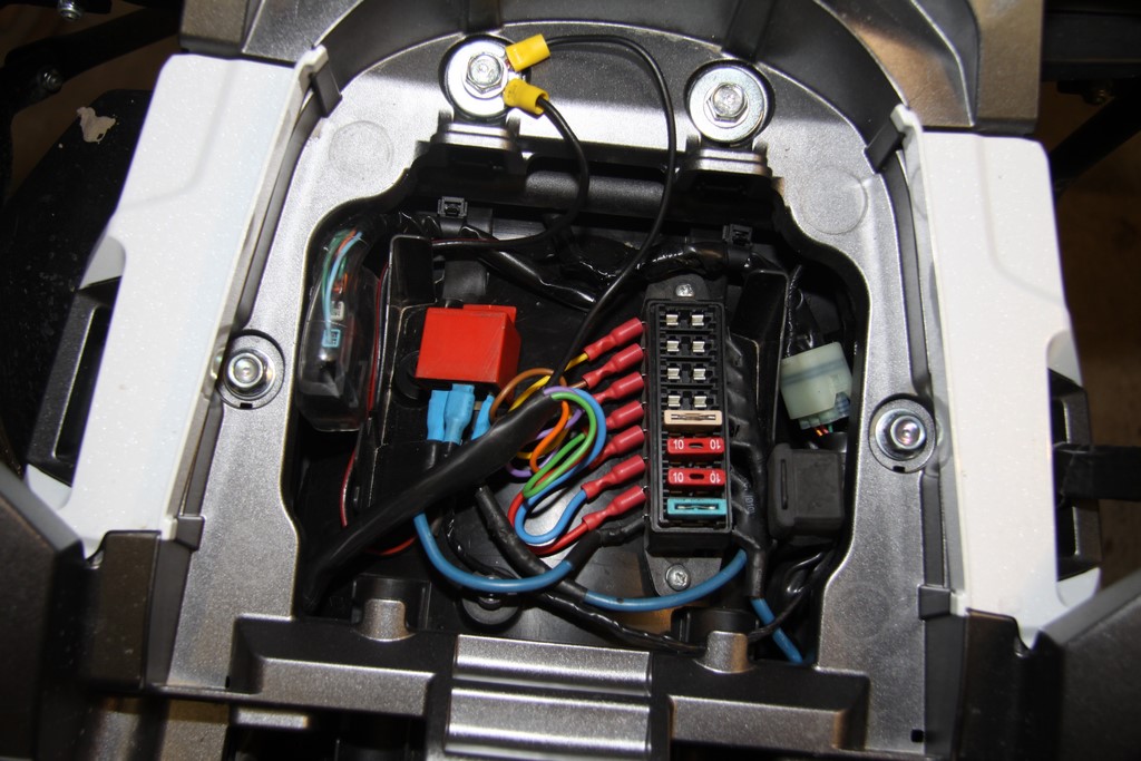 Also habe ich eine Leitung vom Batterie-Plus (fliegende Sicherung 25A im Batteriefach) bis unter den Sozius-Sitz gezogen,