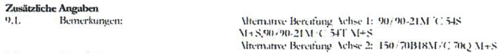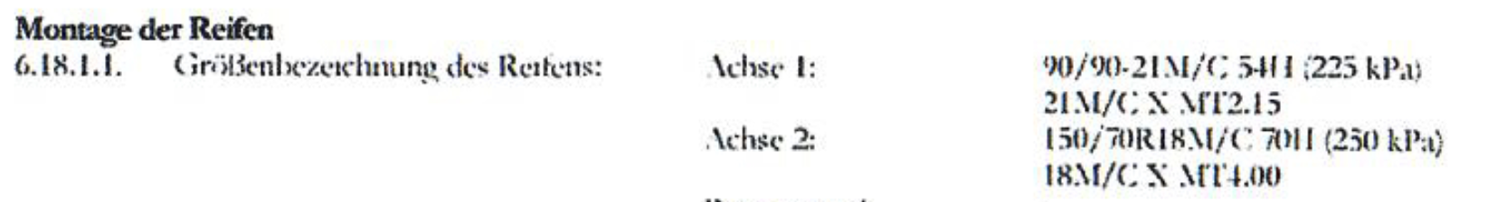 Hinzu kommt die alternative Bereifung, die in der CoC angegeben ist. Das ist scheinbar der "Umweg" für die groben Reifen. Die sollten dann eine M+S-Kennung und dürfen mit passendem Aufkleber gefahren werden (klingt für mich nach einer Hintertür für die Groben, ist aber offensichtlich okay).