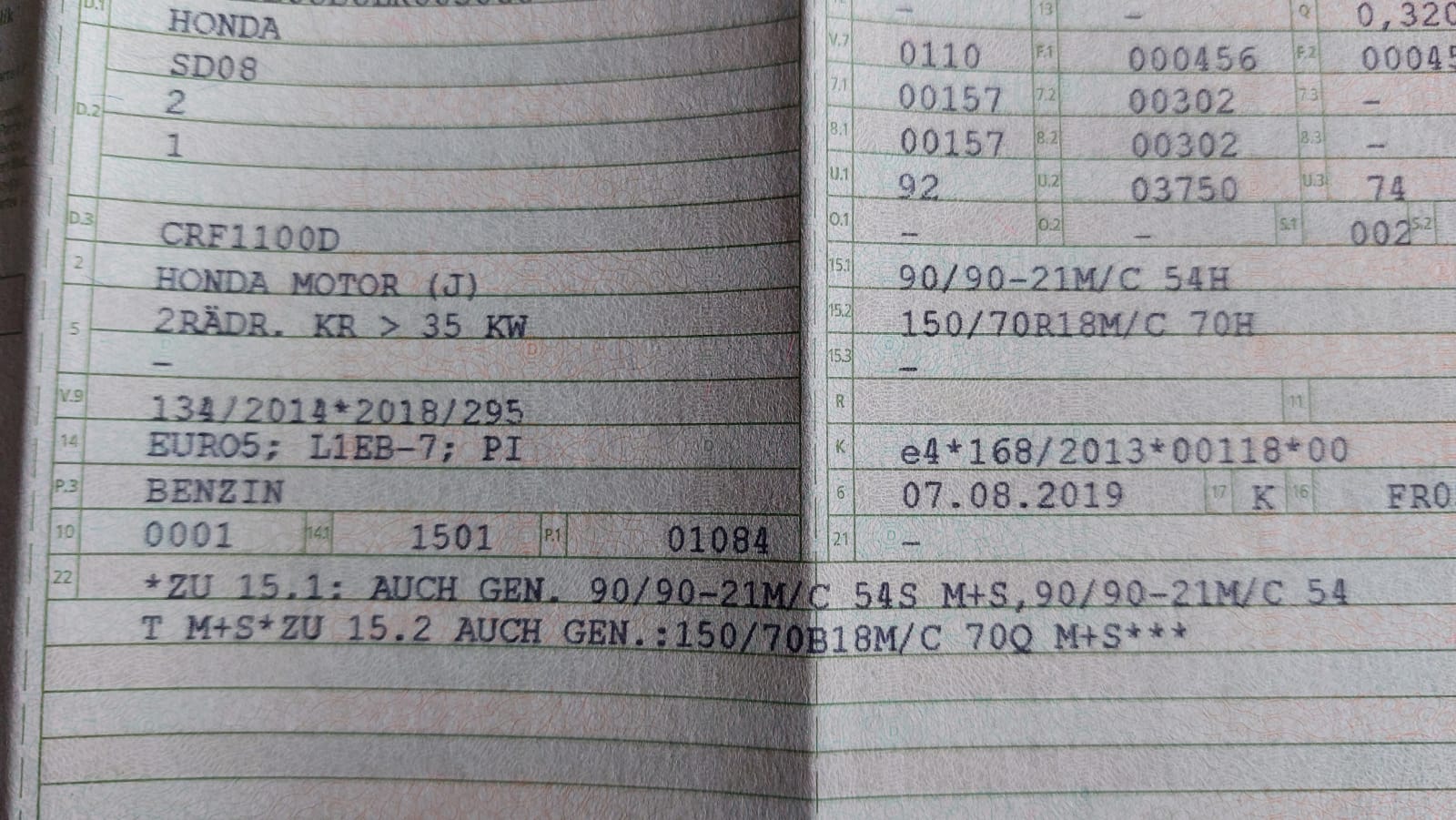 Nun stimmts, für Achse 1 (Zeile 15.1) ist 90/90-21 54H und Achse 2 ( Zeile 15.2) ist jetzt 150/70R18 70H eingetragen. Die Alternativbereifung ist unten in der Zeile 22 eingetragen