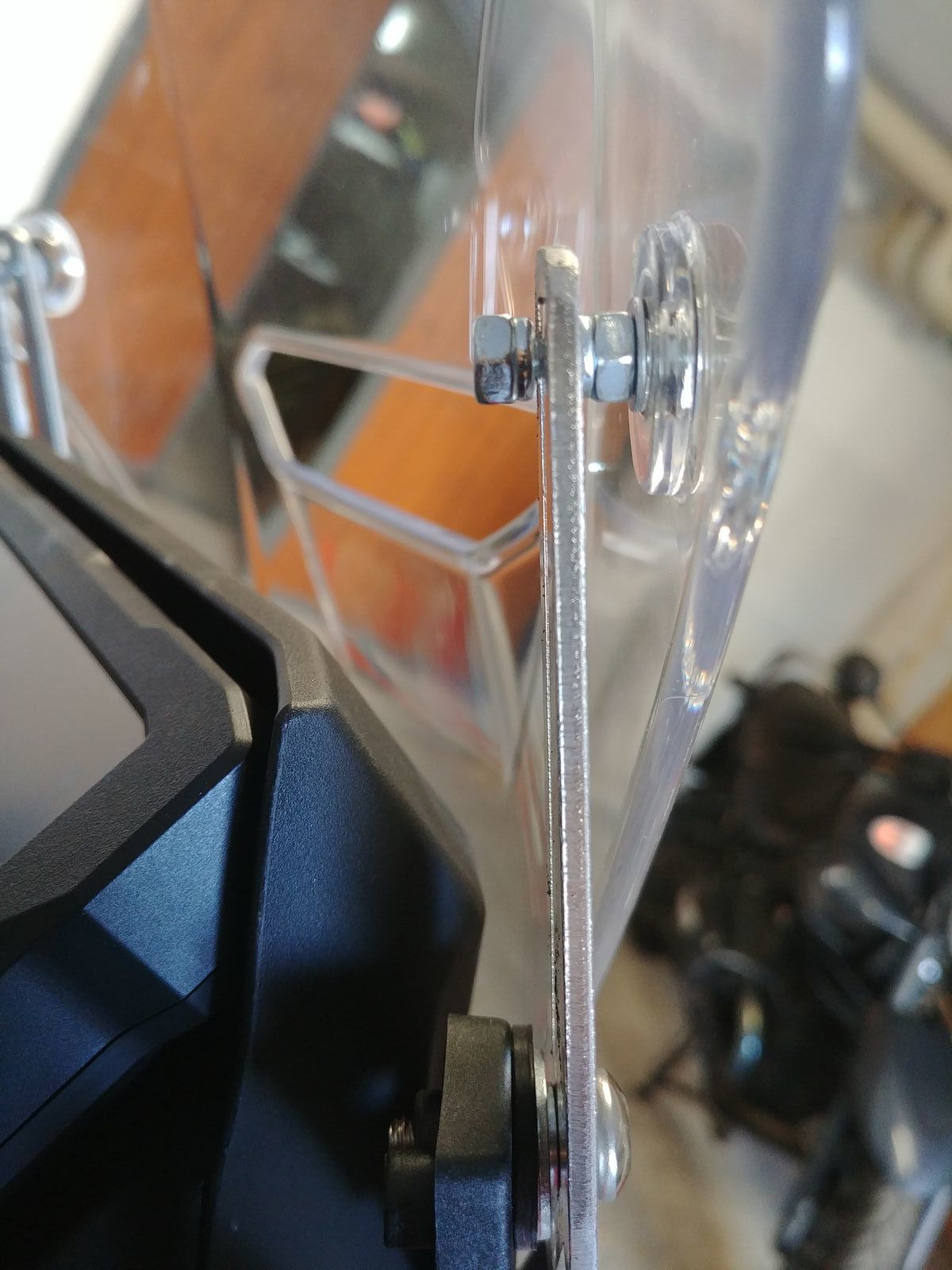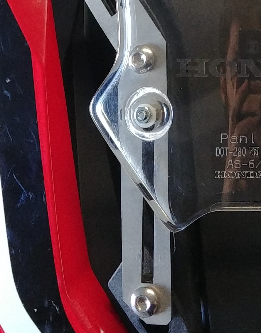 Das Windschild ist in der niedrigsten Position ca. 1,5 cm höher und lässt sich jetzt einfach mit der Hand um ca. 7cm-8cm verstellten, auch während der Fahrt. Durch den Anpressdruck der Führungen wird die Scheibe sehr fest gehalten. Falls sie bsp. im Offroadbetrieb doch rutschen sollte, dann können die oberen Schrauben einfach komplett angezogen werden. Abnutzung der Führung ist nicht zu befürchten, da besonders harter Edelstahl verwendet wird. Höchstens die Schrauben müssen möglichweise irgendwann mal für ein paar Cent erneuert werden.
