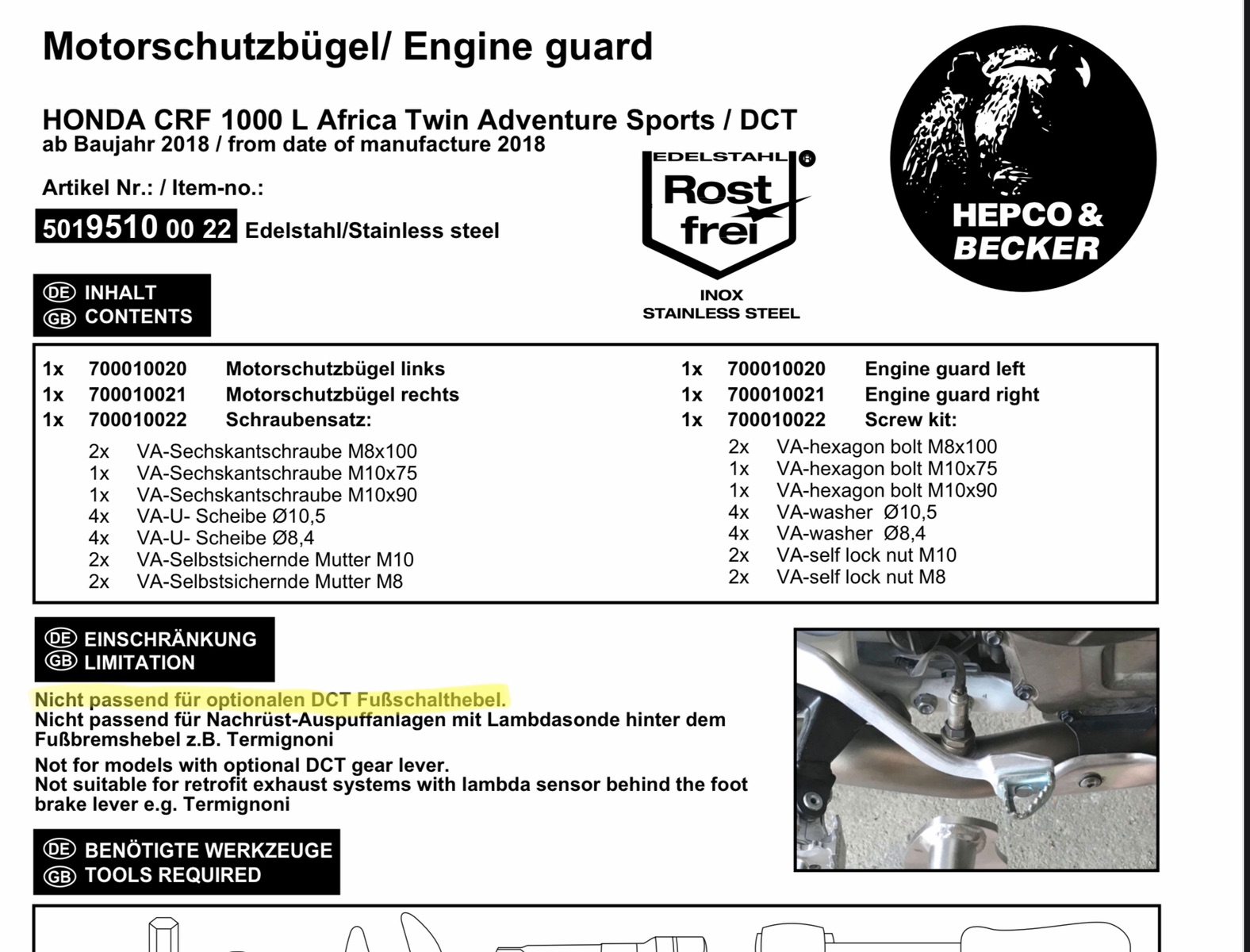 Auch für DCT. DCT Filter ohne Einschränkungen zu erreichen. Nicht passend für Nachrüst-Auspuffanlagen mit Lambdasonde hinter dem Fußbremshebel z.B. Termignoni.