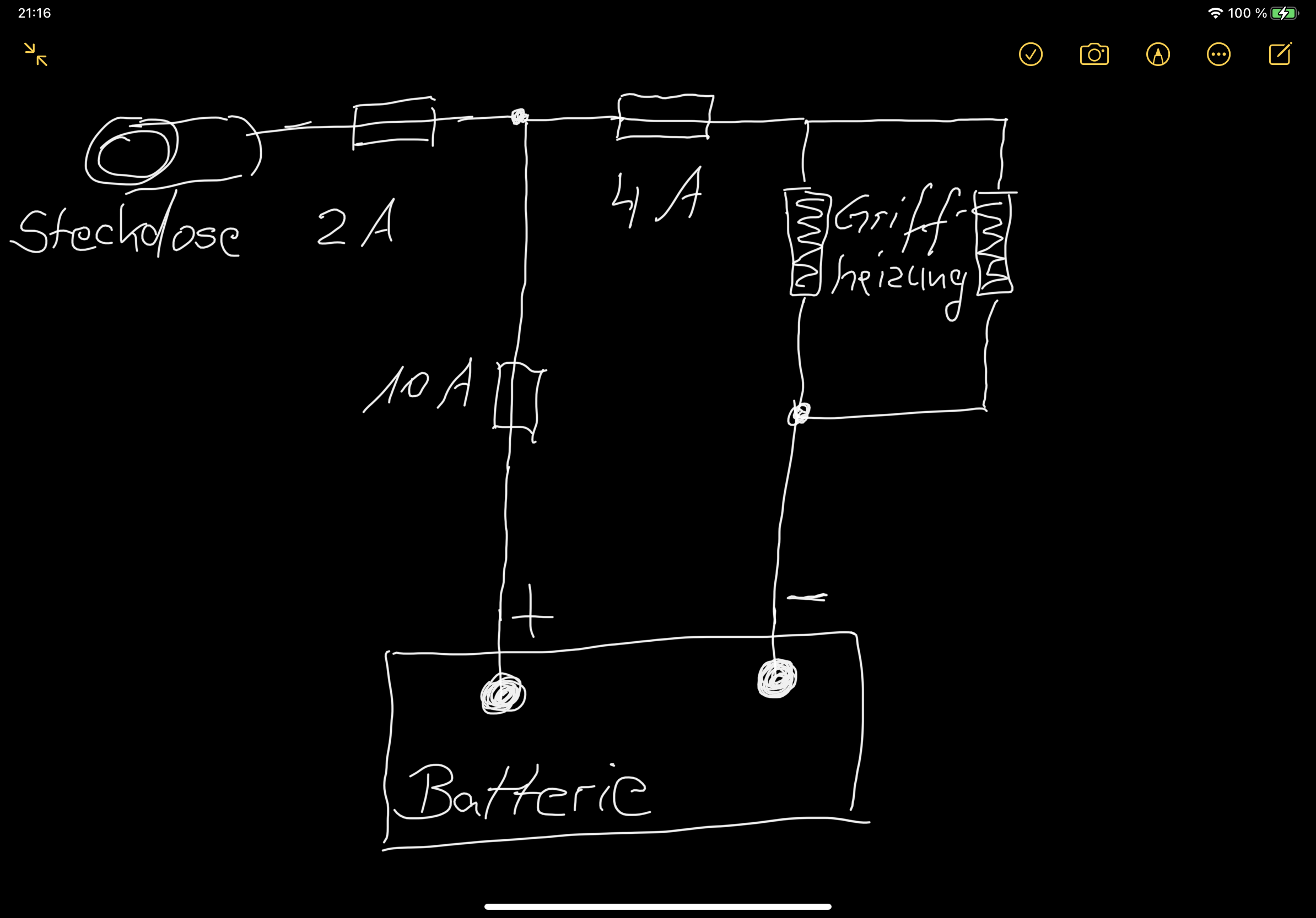 Also nochmal zum Verständnis, die 12v Steckdose mit 2A Aufdruck wird mit Stecker + Kabel geliefert. Dieses Kabel will ich auftrennen und zusätzlich die Heizgriffe drann löten. Also die Kabel der Steckdose werden dann bis max. 6A (4A + 2A) belastet. Weiter später im Kabelbaum wäre noch das kurvenlicht angeschlossen, dieses ist aber nicht vorhanden.