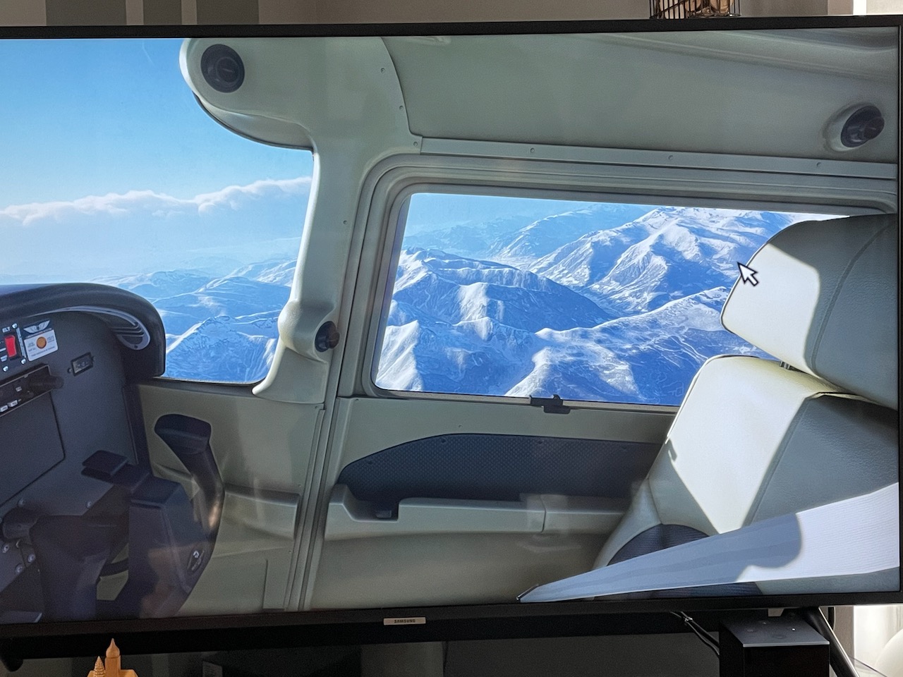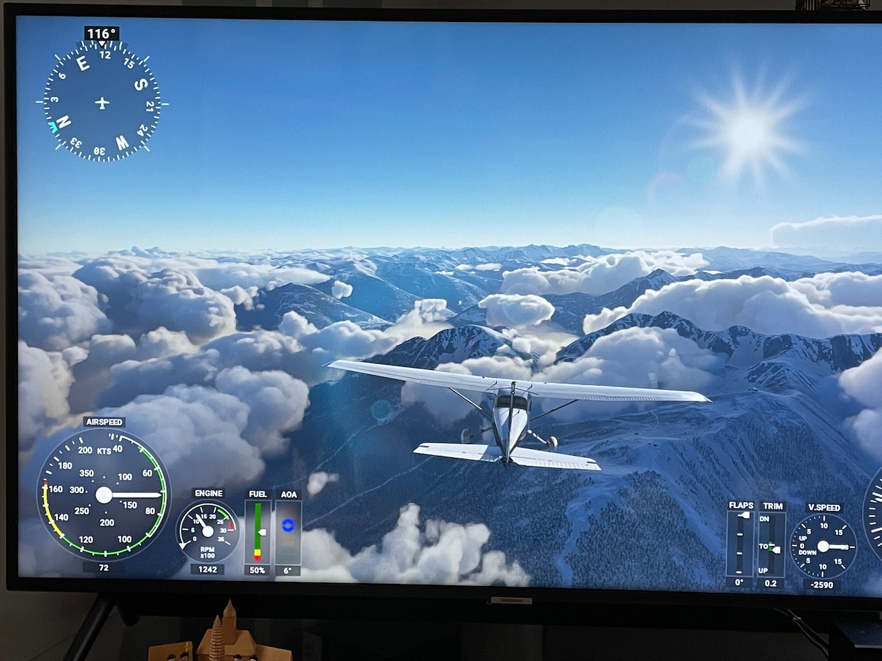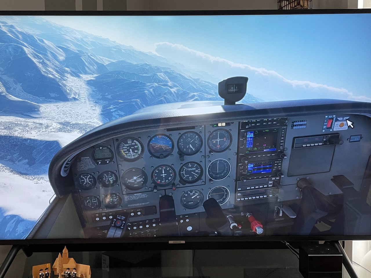 Zur Bildausgabe nutze ich aber nicht das mickrige 15,6" Display der Laptops sondern meinen 49" Smart TV per HDMI. Die Bilder sind gestern Vormittag entstanden als ich in Innsbruck (LOWI) bei Real-Weather gestartet bin. Mit der 172er ab in Richtung Südtirol/Adria. Einfach mit dem Handy vom TV abfotografiert deshalb leider nicht sonderlich scharf...