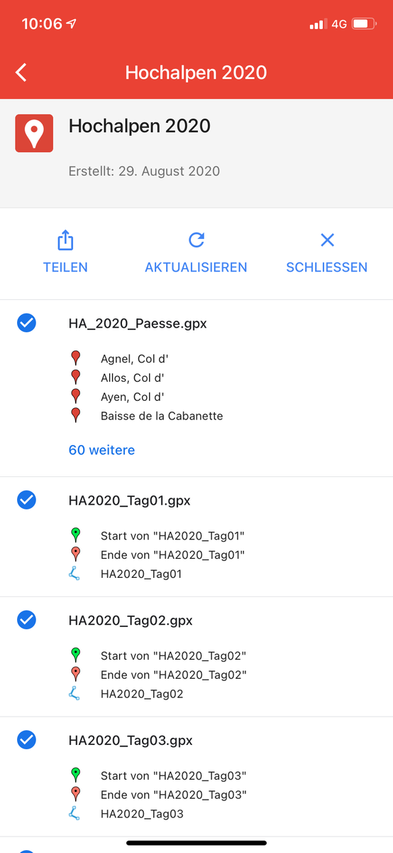 Aber du kannst auch GPX-Dateien in Google Maps abspeichern und dann auf dem Handy anzeigen lassen: in Google anmelden und mit Maps unter "Meine Orte" -> "Karten" "Karte erstellen" und GPX-Datei(en) abspeichern.