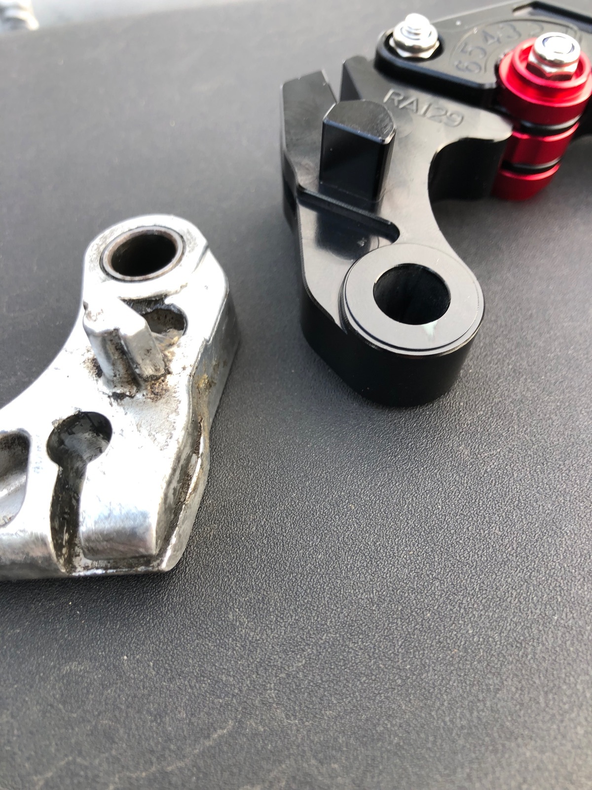 Ach übrigens: die Hebel von V-trec passen tatsächlich nur auf die 1000er, auch wenn in der ABE was anderes steht. Grund dafür ist diese kleine Fräsung am Kupplungshebel, die für die 1100er benötigt wird. (Hier Fräsung am Original- und Raximo-Hebel)