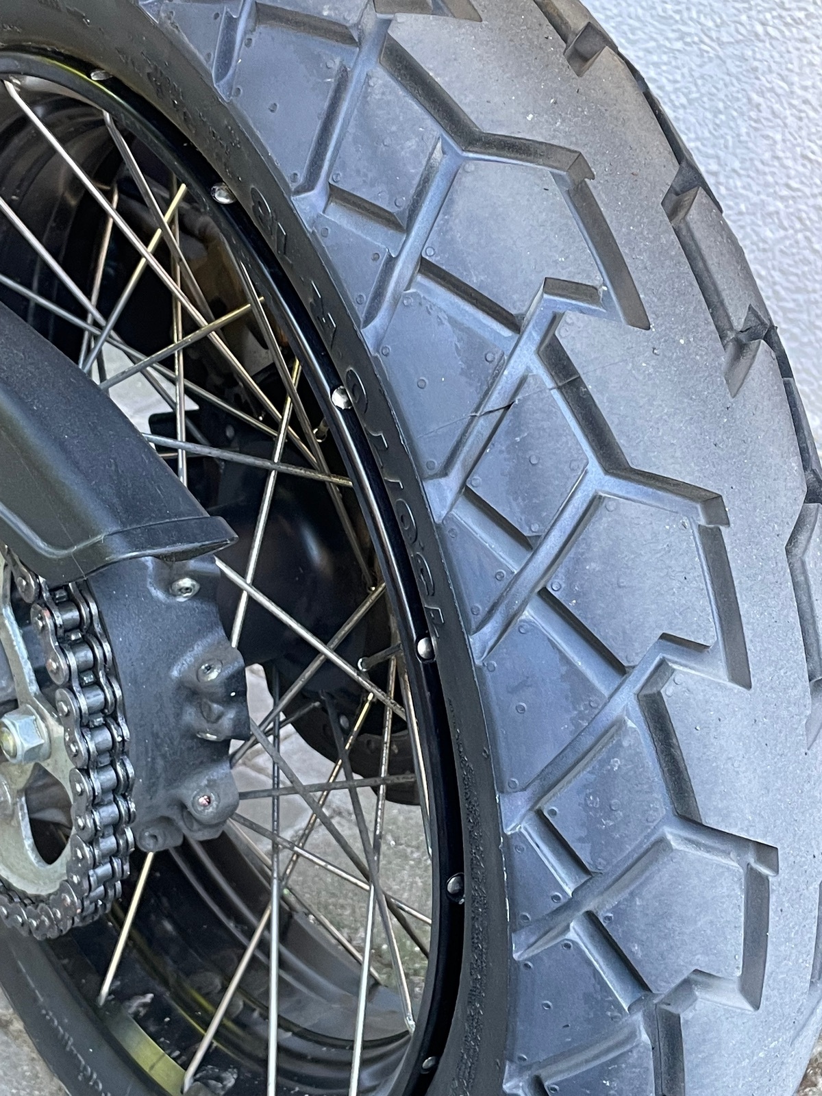 Leider hatte der gelieferte Vorderreifen einen Produktionsfehler. Er ließ sich nicht auswuchten und hat auf der linken Seite einen extremen Höhenschlag.