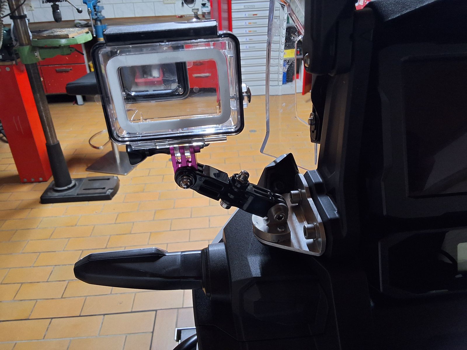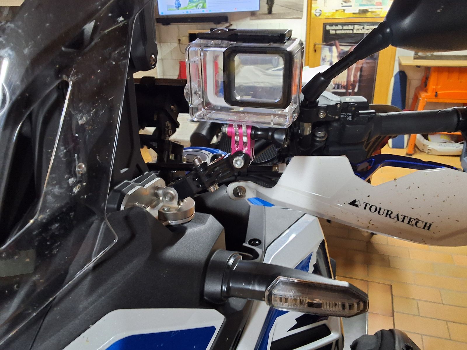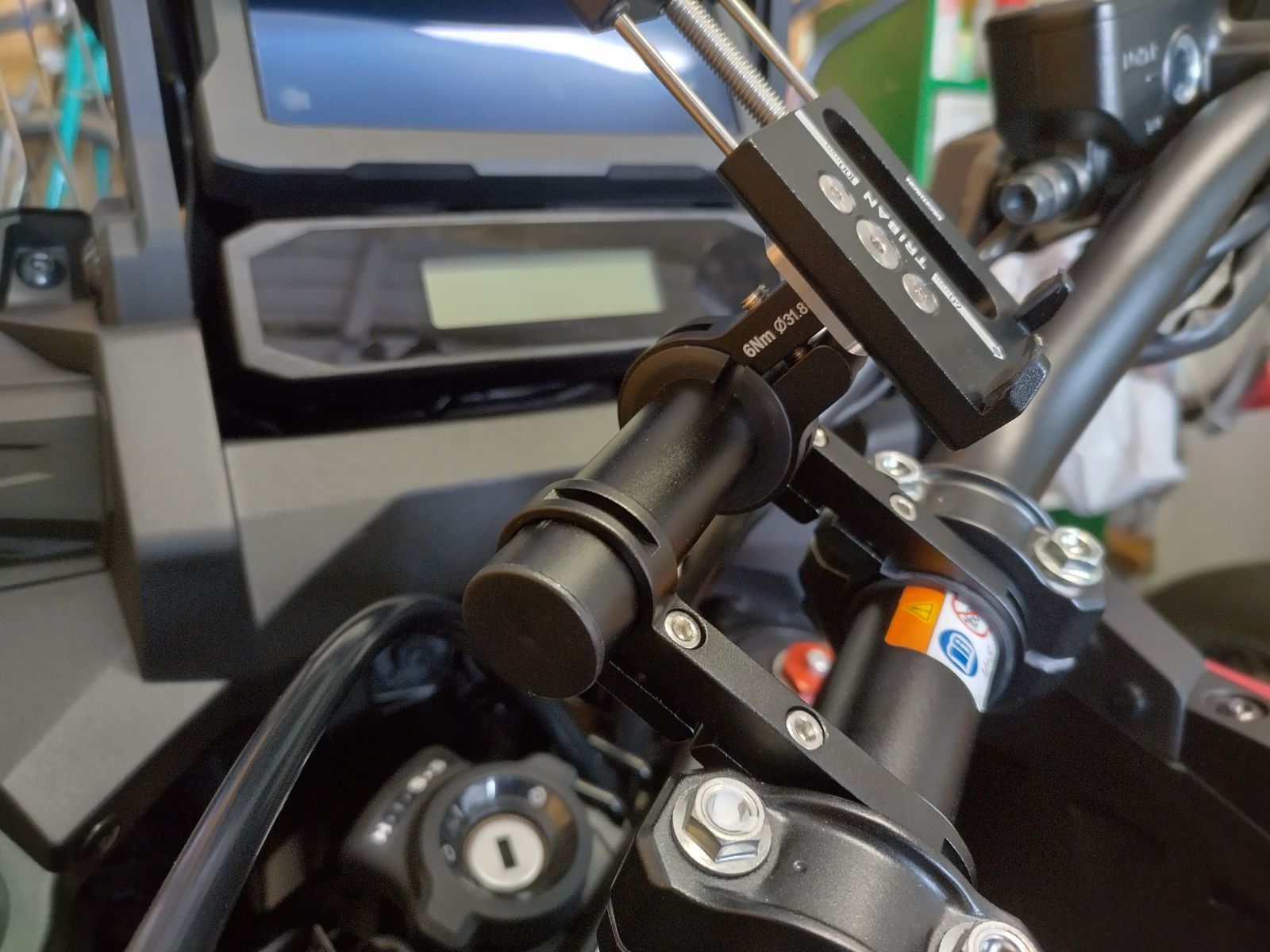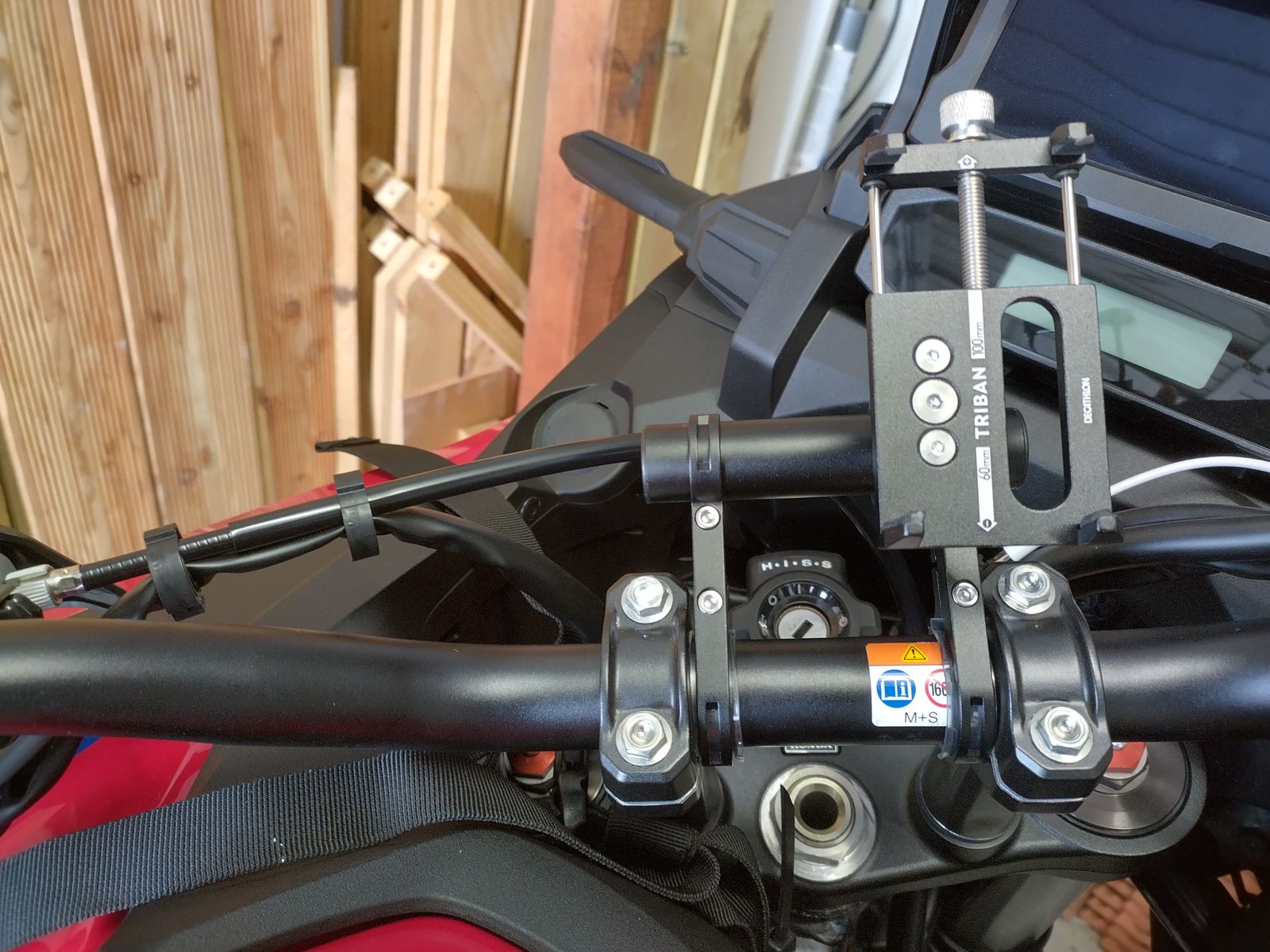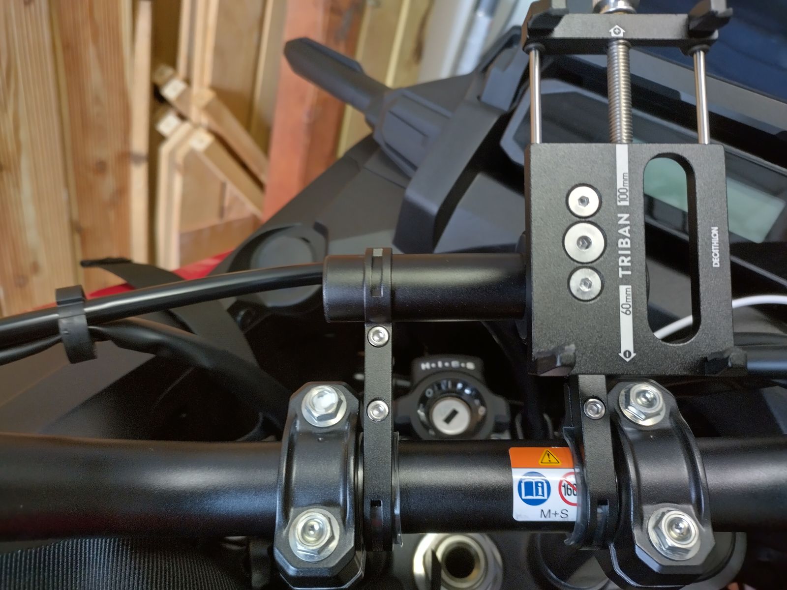 ich hatte die Idee den vorhandenen Fahrrad-Smarthonehalter an eine Lenkerstrebe zu schrauben, weil direkt am Lenker ist das nur ohne Tankrucksack ablesbar.