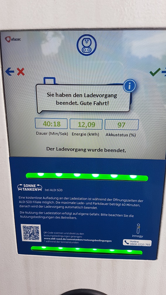 Mit 230 km Reichweite kommen wir super klar. Laden kann ich zuhause an der Wallbox, somit brauche ich keine Karte für unterwegs.