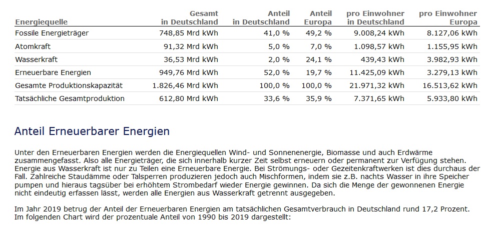 Den nachfolgend gezeigten Bildern oder Tabellen ist folgender Text vorgeschaltet. Also nicht zu früh freuen über 52% deckung durch Erneuerbare Energien, (ein theoretisch Wert). Wie oben im Symposium von Werner von Sinn gezeigt , haben wir n tatsächlichen Anteil durch ernerbare Energien , von 5-6% , Und viel von unserer Energieerzeugung muss vorgehalten werden, weil eben PV nachts schlechter läuft, und beu Windstille auch die Growians nicht wirklich. Auch 20mal mehr solche Anlagen bringen es nicht wirklich, es herrscht ja Windstille.