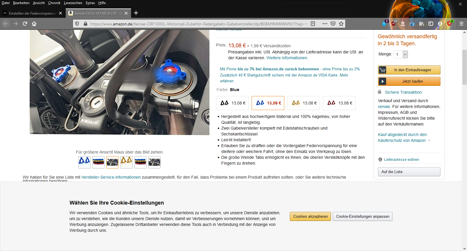 Ich habe vor ca. 2 Monaten, vor der Winterpause, "Flügel" zum Verstellen der Vorspannung der Gabelfedern bei Amazon gekauft und auch gleich damals installiert.