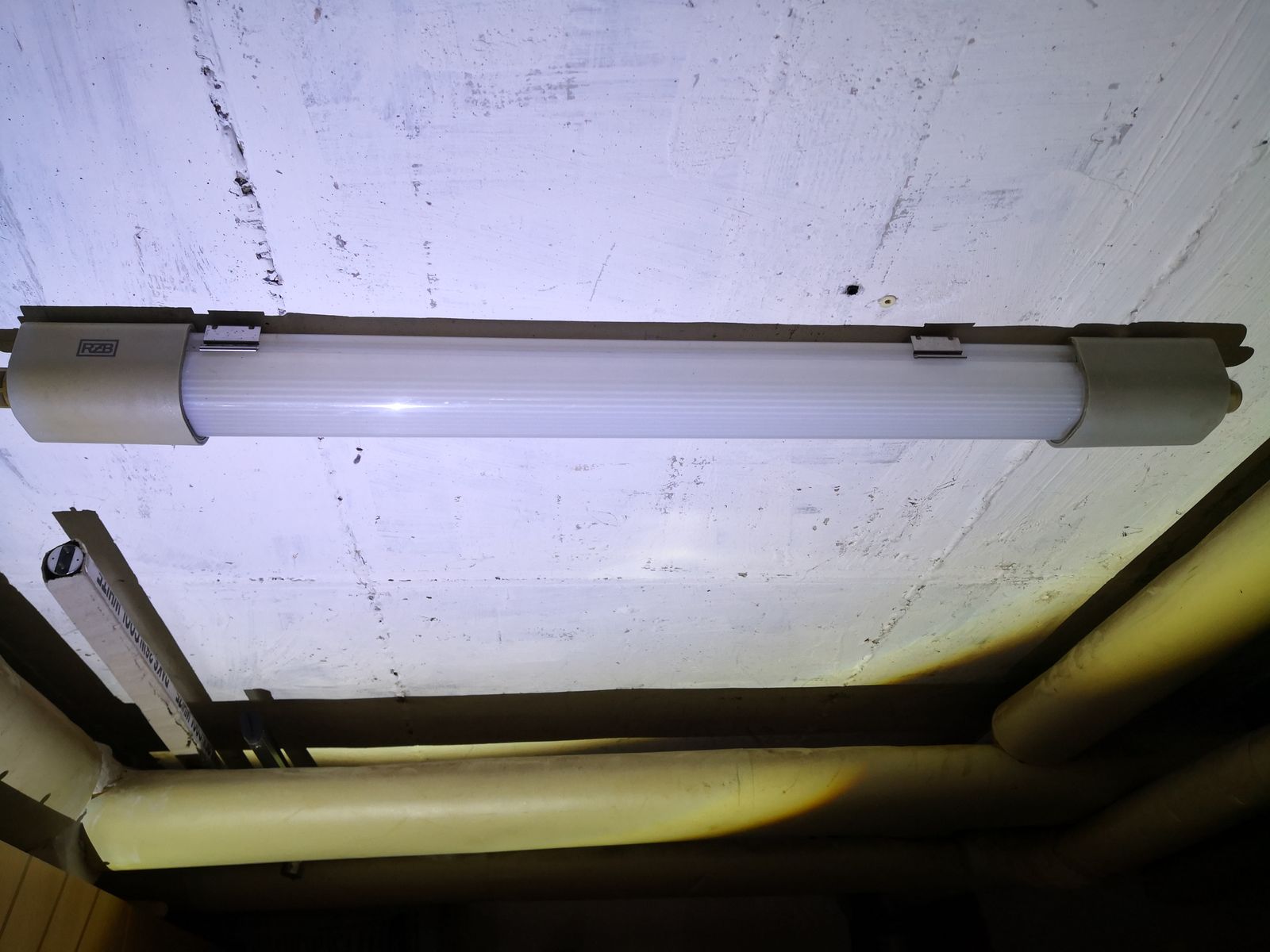 Leuchte hat max. 20W ( Typ, Lumen und Kelvin ? Hab grad das Datenblatt nicht zur Hand ) und hat eine höhere Lichtausbeute als eine Standard T8 Röhre 36W/840 in einem vergleichbar großen Raum im Keller ohne Fenster.
