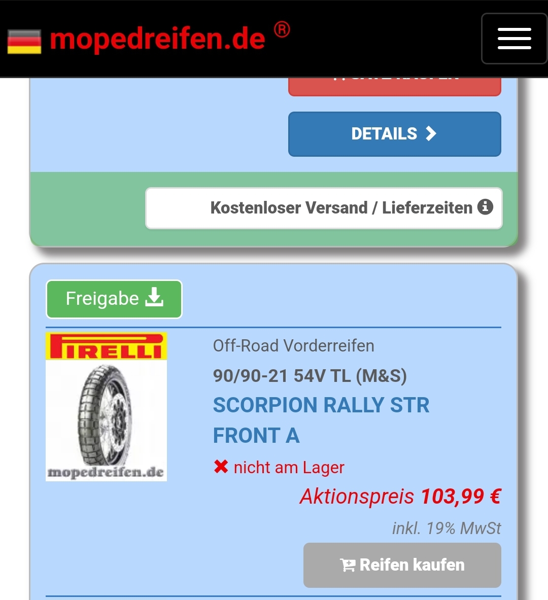#63 Alles anzeigenMopedreifen.de verkauft nur den Pirelli Scorpion Str als A Version, vmtl ist auch deshalb das Vorderrad seit 8 Wochen nicht mehr lieferbar. Ich habe daraufhin bei reifen.com bestellt, die führen wiederum 2 Versionen des Reifens. Bei reifen-direkt.de ist es das gleiche.