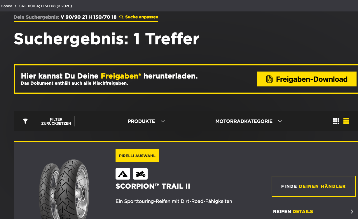 #69 Alles anzeigenAuf der Pirelli Internetseite ist für meine 1100 SD08 nur der Scorpion Trail 2 aufgeführt.
