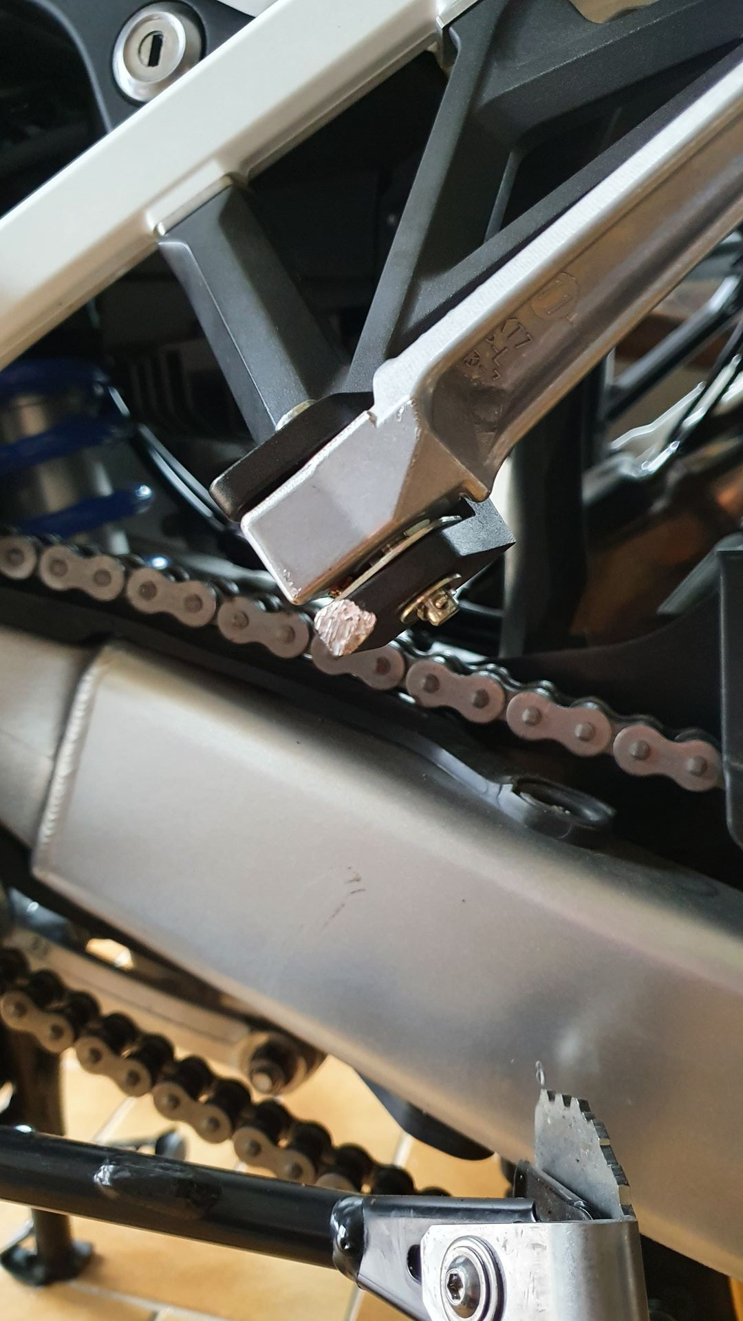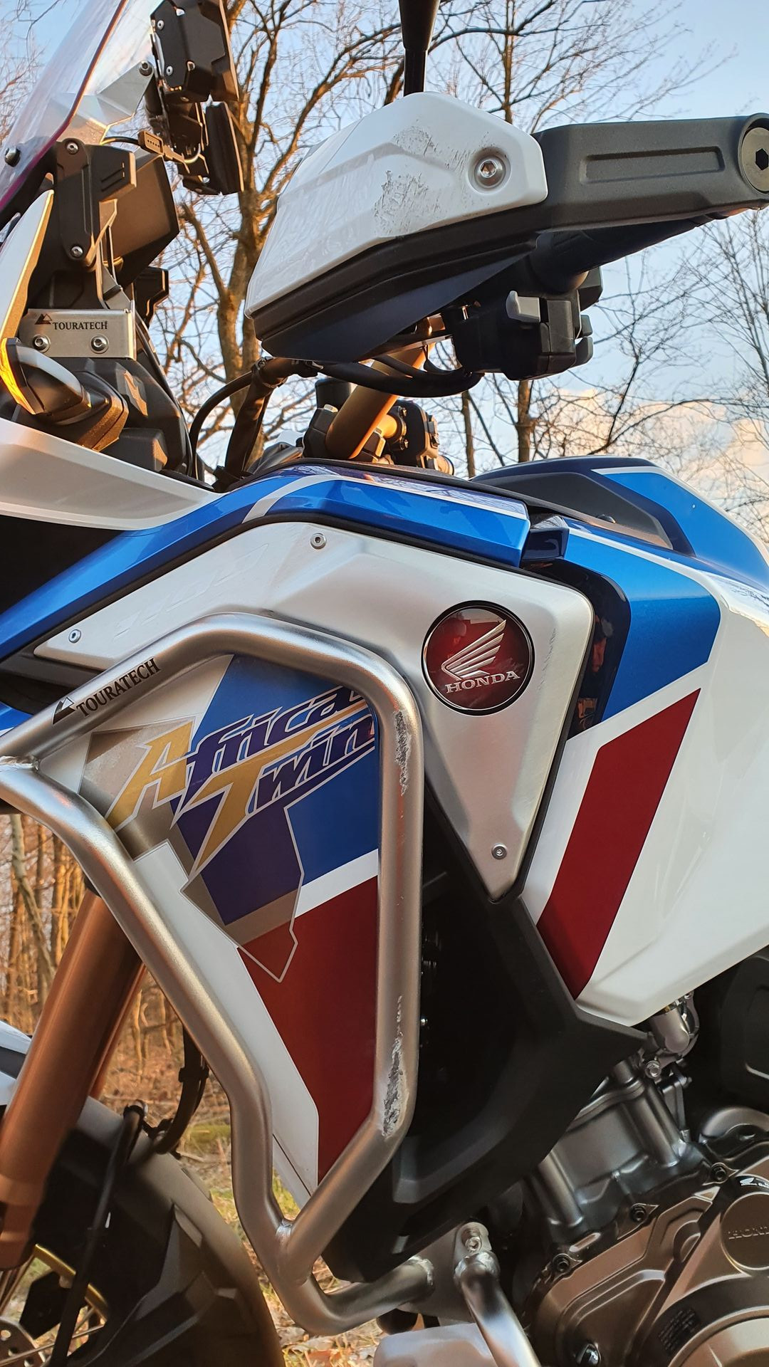 Der obere Bügel hatte aufs Verkleidungsblech durchgeschlagen. Ist leicht verbogen u.zerkratzt. muss getauscht werden. (Aluteil gibts aber nicht einzeln von Honda)