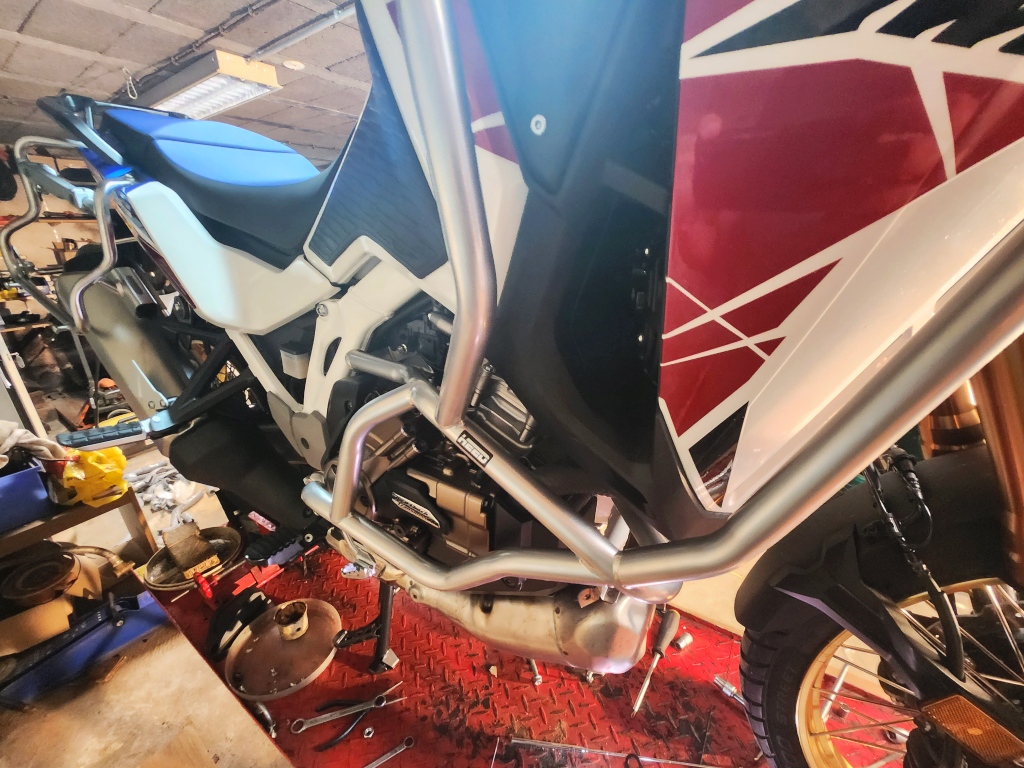 Alles anzeigenHallo, ich hatte die Bügel von Motea dran, auch die unteren. Nach einem Umkipper auf weichem Untergrund hat mir der rechte "Motorschutzbügel" die Ölschraube (DCT) soweit verdrückt, dass ein Riss entstanden ist. Mir ist es erst nicht aufgefallen, da nach dem Aufrichten optisch erst Mal alles ok war. Bei Fahren qualmte es dann stark, da Öl auf den Auspuff gekommen war und nicht nur da, das Hinterrad war auch voller Öl. Konnte nicht weiterfahren, da Gefahr bestand, dass sich die Bremse verölt würde. Kostenpunkt neuer Seitendeckel und Bremsen ca. 1000€ !!! Fazit: der untere rechte Bügel ist ungeeignet, lag schon bei der Montage zu nahe an. Lt. Moteo ist er aber für Schaltgetriebe und DCT geeignet, vielleicht solange, bis die Maschine nicht kippt... - mein Rat- Finger weg!!! Wird teuer!!!