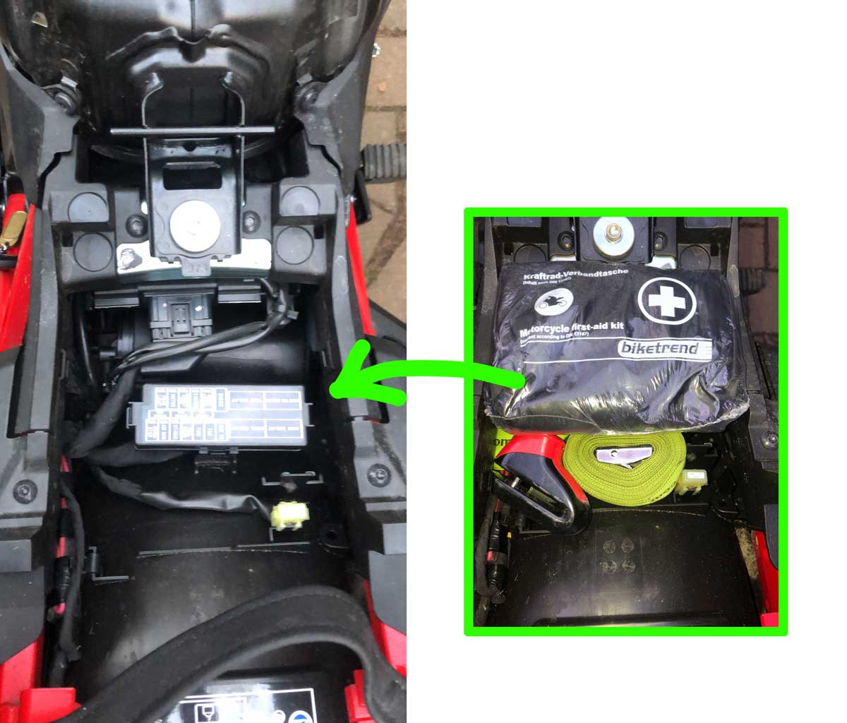 mein Titel sagt ja schon alles ... seid ihr auch so welche, die jeden Kubikzentimeter unter der Sitzbank nutzen wollen? Ich habe das Bordbuch rausgenommen, weil ich es immer als PDF auf dem Handy dabei habe. Dafür sind jetzt lauter kleine Helferlein unter die Sitzbank gezogen: Verbandskasten, Bremsscheibenschloss, Zurrriemen, Minirucksack für Spontaneinkäufe ...