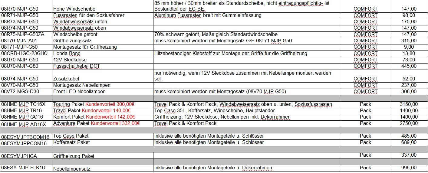 Habe bei dieser Gelegenheit die Preisliste inkl. der Teilenummern fürs Zubehör bekommen. Hondatypische Preise. Aber wir können