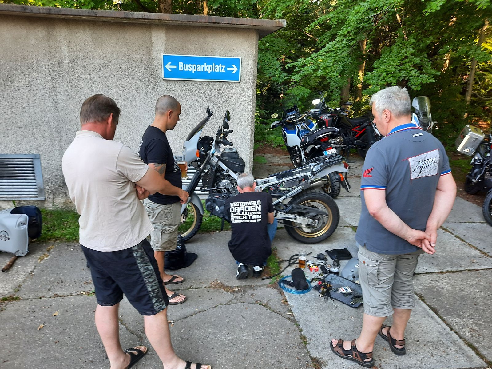 #117 Ja, im Nachhinein schon. Auf der Hinfahrt ging nach ca 500 KM in Thüringen jedoch erst mal nix mehr. Bock aus. ende. Hab dann schnell rausgefunden, dass die Spritpumpe wohl nicht mehr fördert. Diese war nagelneu und gerade erst eingebaut. Also Taxi gerufen, zur nächsten Tankstelle, 10Ltr Kanister nebst Inhalt gekauft und dann die Spritpumpe überbrückt. So habe ich mich bis Chemnitz durchgeschlagen, musste allerdings alle 30-40 KM nachtanken, da ab dann der natürliche Benzindruck nicht mehr ausreicht. In Chemnitz dann einen Hilferuf im XRV-Forum gepostet, worauf sich Mattes meldete, der tatsächlich auch auf dem Weg nach Oybin beheimatet ist. Er hatte noch eine von seiner RD04 da liegen, wusste aber nicht, ob diese auch funktioniert da er sie nie gebraucht hatte. War wohl eine Zugabe beim Mopedkauf. Also weiter bis zu Mattes, der mich freundlichst mit einer Tasse Kaffee empfing. Spritpumpe gewechselt, Startknopf gedrückt, lief! Dann weitergefahren und nach 40KM das gleiche Spiel. Bock aus, Ende. Spritpumpe förderte wieder nix mehr. Dass die Dinger anfällig sind, ist ja bekannt. Aber dass man davon 2 am Tag braucht, damit hatte ich nicht gerechnet. Dann telefonisch mit Unterstütung von schwagutec versucht, den Fehler einzugrenzen, was uns aber nicht wirklich gelang. Zwischenzeitlich meldete sich Rüdi und teilte mir mit, dass er über Jörg und deren Freund Andi eine Mikuni Unterdruckpumpe organisiert hatten. Da diese keinerlei elektrische Ansteuerung benötigt, für mich das perfekte Austauschteil. Also weiter Richtung Oybin. Jetzt riss im 1/2 Stunden takt die Benzinleitung, die meine Art der Überbrückung mit einer abgesägten Kugleschreiberhülle wohl nicht so toll fand und nach 27 Jahren Dienst wohl etwas an Spannkraft eingebüßt hatte. Ich war nach 3 Benzinschlauch-Fkickversuchen mit Benzin eingesaut wie nie zuvor in meinem Leben, habe es aber bis Oybin geschafft. Dann vorbereitend direkt Verkleidung runter, Tank ab und bei den ersten Tschechischen Bierchen auf Rüdis Gruppe gewartet. Als diese eintrafen, begab ich mich direkt, mit freundlicher Unterstützung von @Franky78 an den Einbau, schließlich wollte ich ja die Tour am nächsten Tag mitfahren. Jedoch fehlte uns ein kleines Bauteil, der Schraubnippel für den Unterdruckschlauch, welcher am Ansaugstutzen eingeschraubt wird. Gott sei Dank hatte der örtliche KTM-Händler sowas vor Ort, ließ seinen Laden extra wegen uns länger auf und half freundlich und unentgeltlich aus. Werde ihm etwas Nettes zukommen lassen. Nachdem das Ganze dann, gefolgt von einem wirren Puzzle unterschiedlicher Benzinschlauchgrößen, mit zusätzlichen Schellen und jeder Menge Kabelbindern montiert war, sprang Bambi dann auch gleich voller Vorfreude auf die bevorstehenden Abenteuer beim ersten Knopfdruck an! Und seit dem lief sie 2 Tagestouren mit heftigen Enduroeinlagen bei 37 Grad Celsius und 679Km Rückreise problemlos durch. Ich bin voller Hoffnung, dass sie nun langsam einen Zuverlässigkeitsstatus erreicht, der einer XRV750 würdig ist!