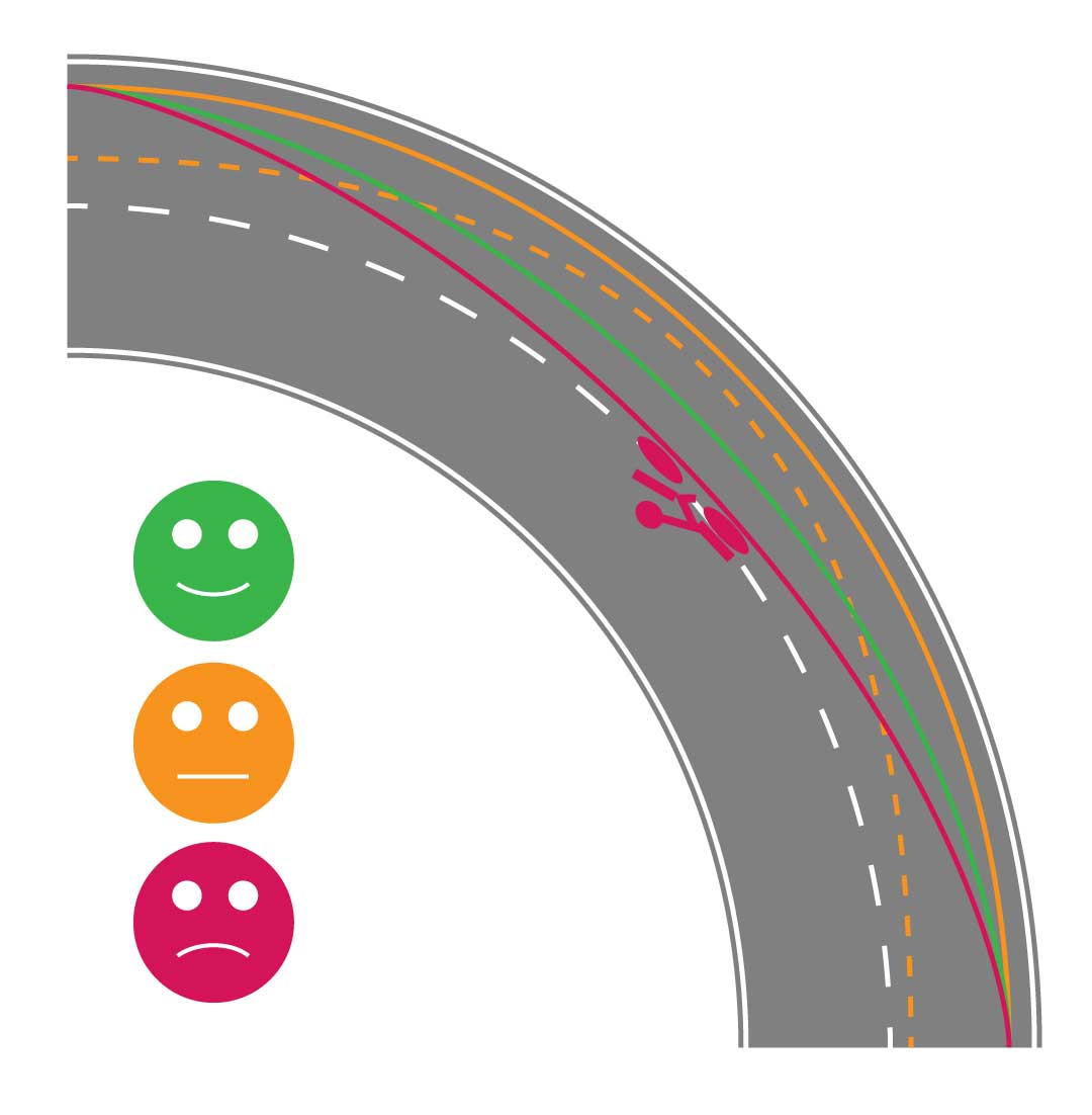 Okay, dann bekommt KandidatNr2 einen RadiusNr2. Letztlich sind die wichtigsten Faktoren: Rumkommen und Obenbleiben! Wenn die Physiker sich gleich dazu melden wollen, werden sie Die sicher erklären, dass Du auf Deiner Route (getrichelt orange) "unnötig" scharf/eckig um die Kurve mußt und insgesammt langsamer bist. Der grüne Radius ist der größte und schnellste im sicheren Bereich.