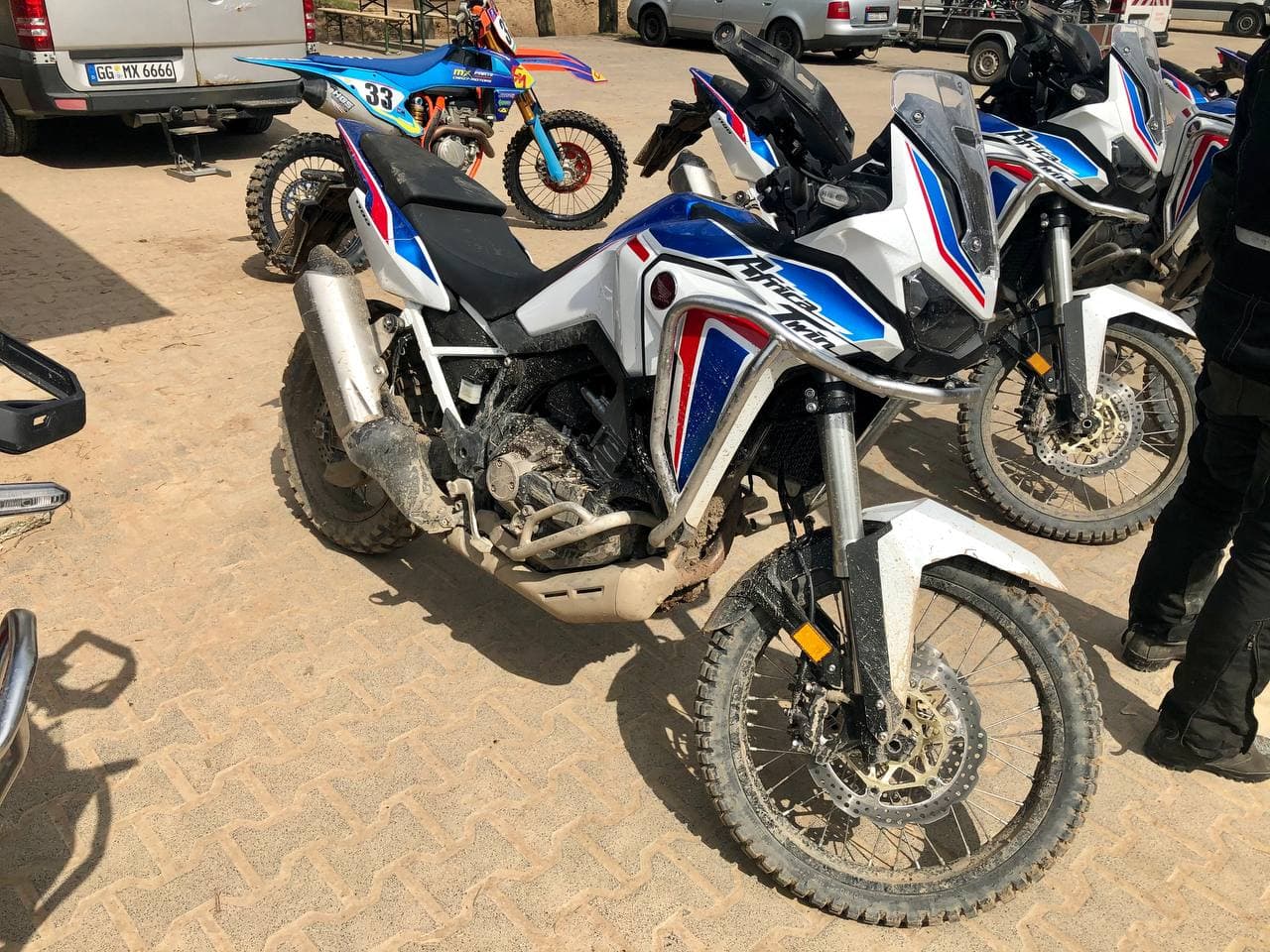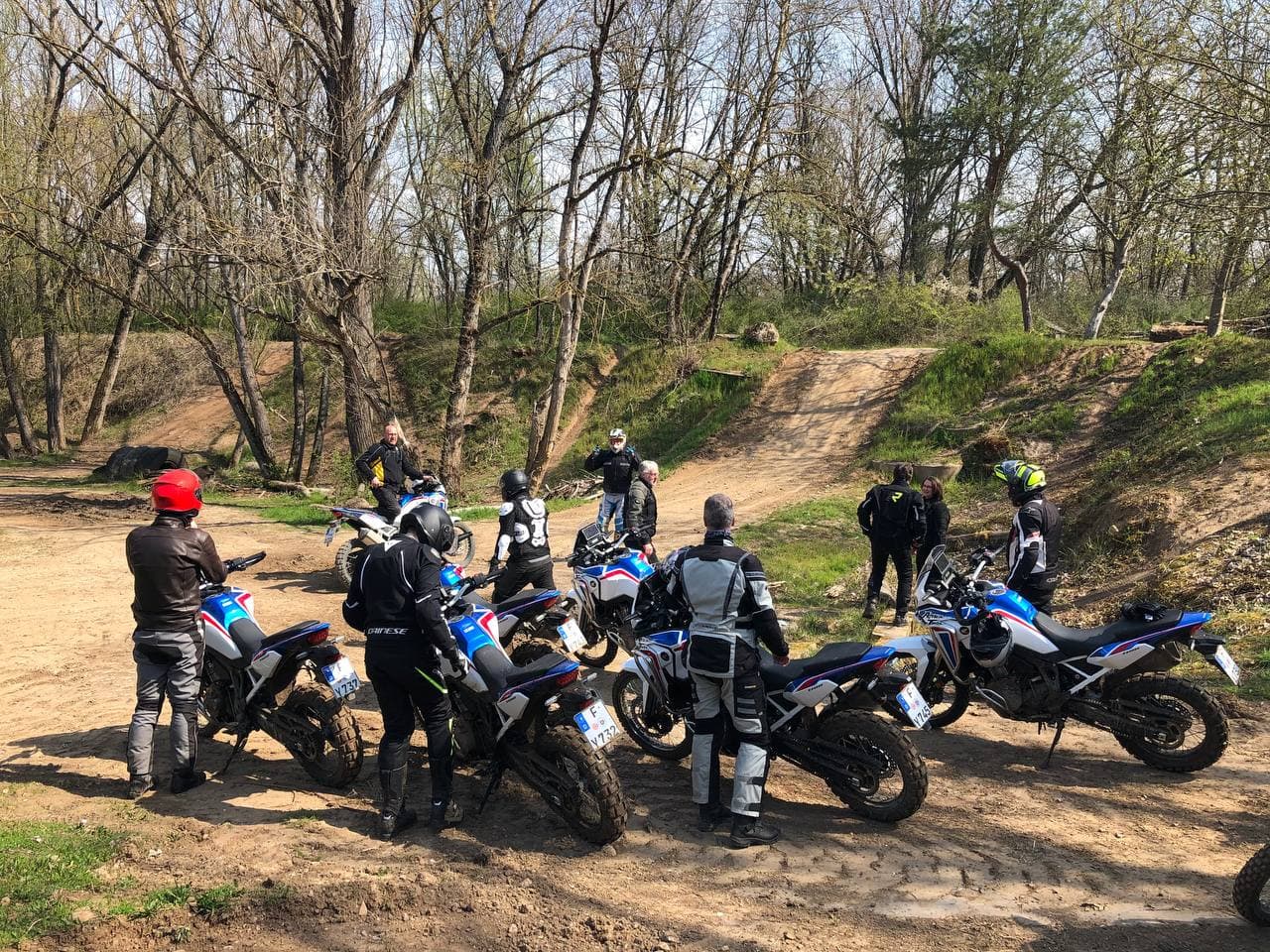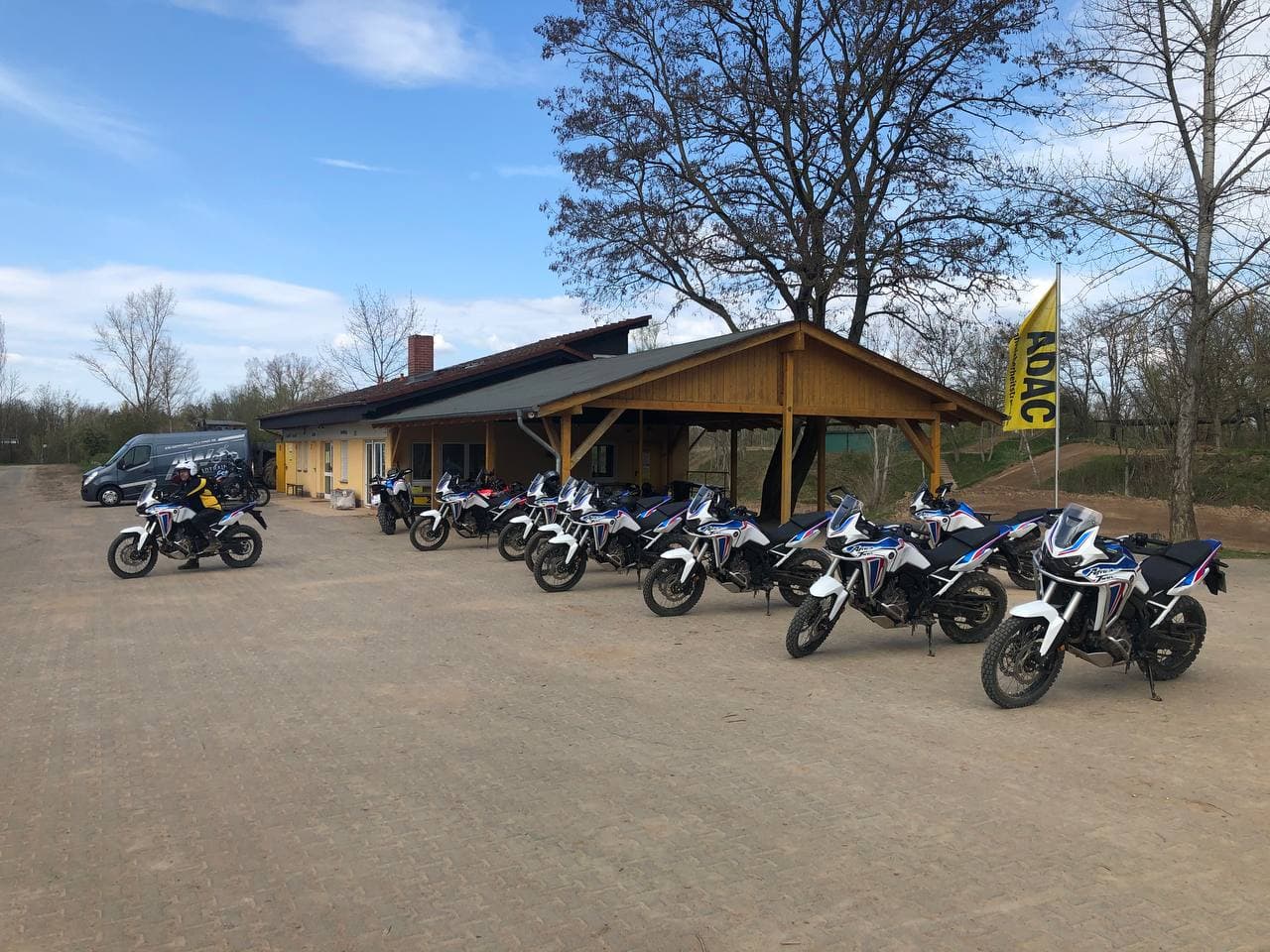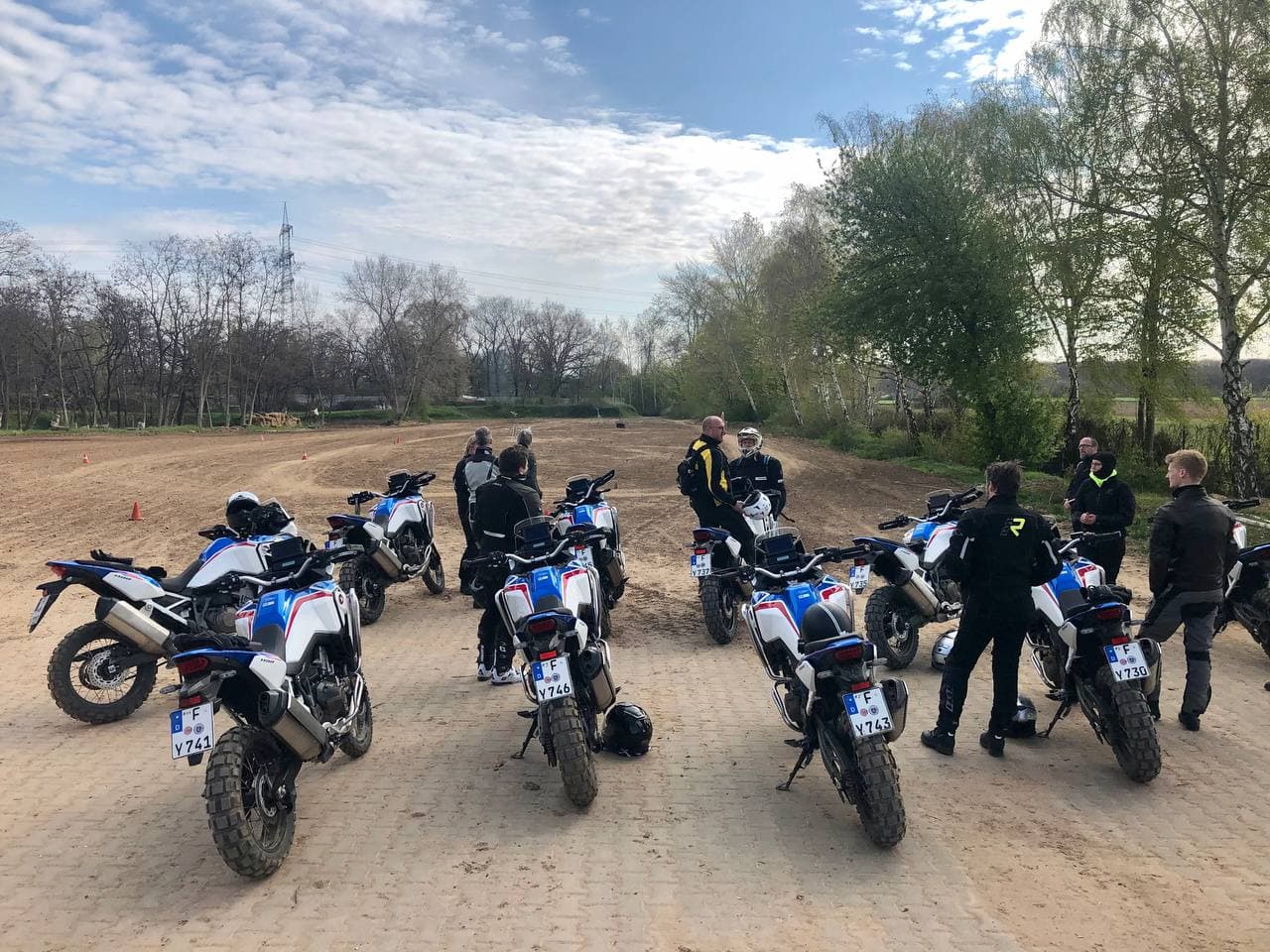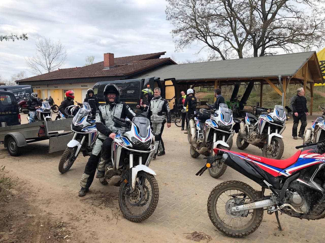 Training mit zwölf nigelnagelneuen AT 2021 in tricolor. Sechs Schalter und sechs DCT. Und zum testen eine neue CRF300.