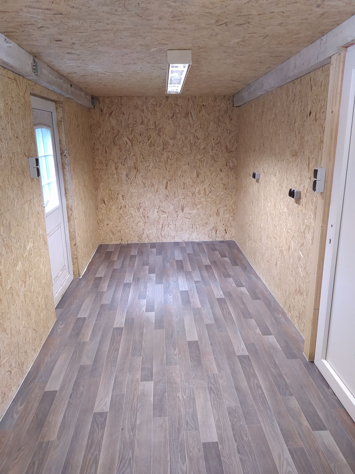 Estrich ist fertig, Eingangstür ist eingebaut, Werkstattmöbel sind geliefert und heute kommt der PVC Bodenbelag rein.
