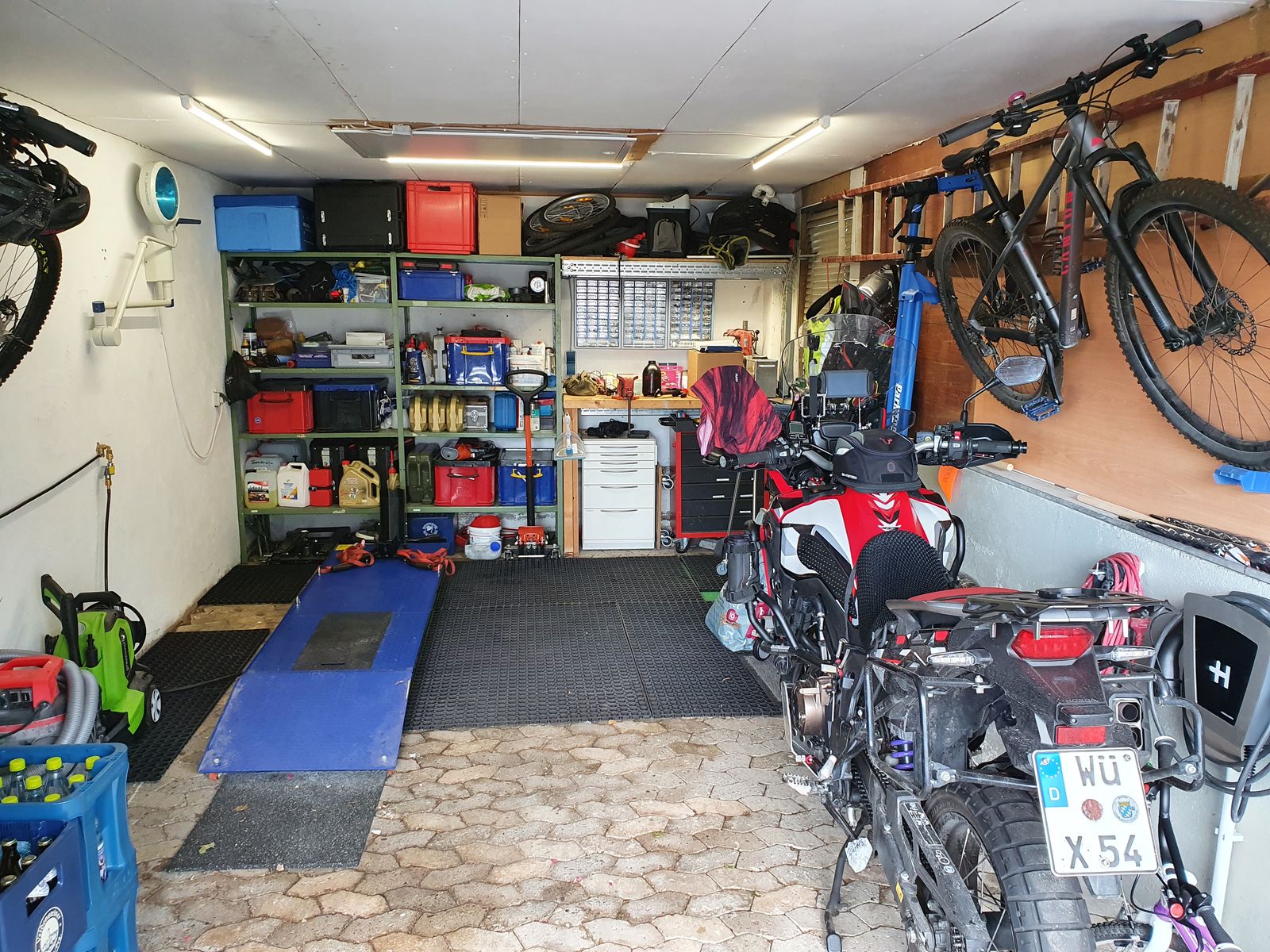 #67 Alles anzeigenIm «Aussenbereich» ist der Maschinenbereich. Dort kann ich bohren, fräsen, drehen, schweissen, schleifen, es ist ein zweiter Kompressor, eine Reifenmontiermaschine und eine Wuchtmaschine vorhanden. Diesen «Aussenbereich» bringe ich derzeit auf Vordermann; es gibt noch einiges zu tun und deshalb derzeit noch kein Bild davon. Sieben weitere Schiebetürschränke wie auf dem Bild sind aber bereits installiert.