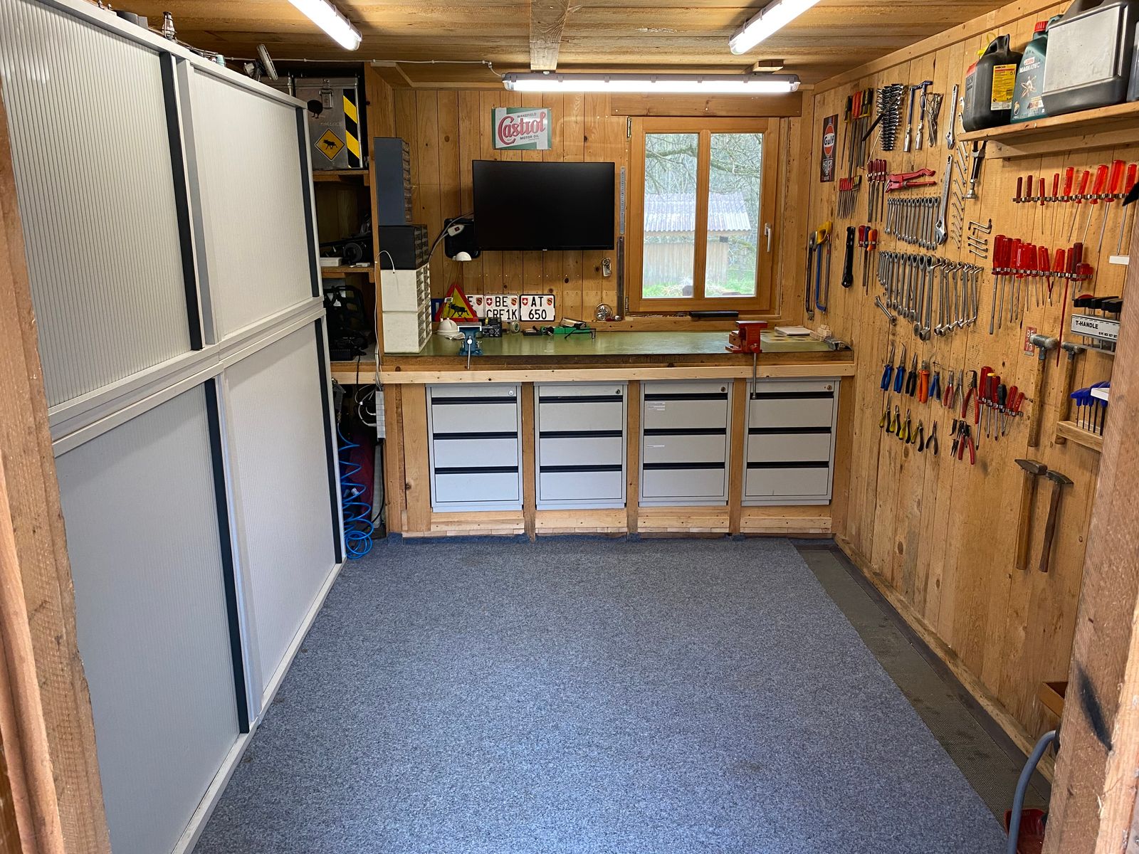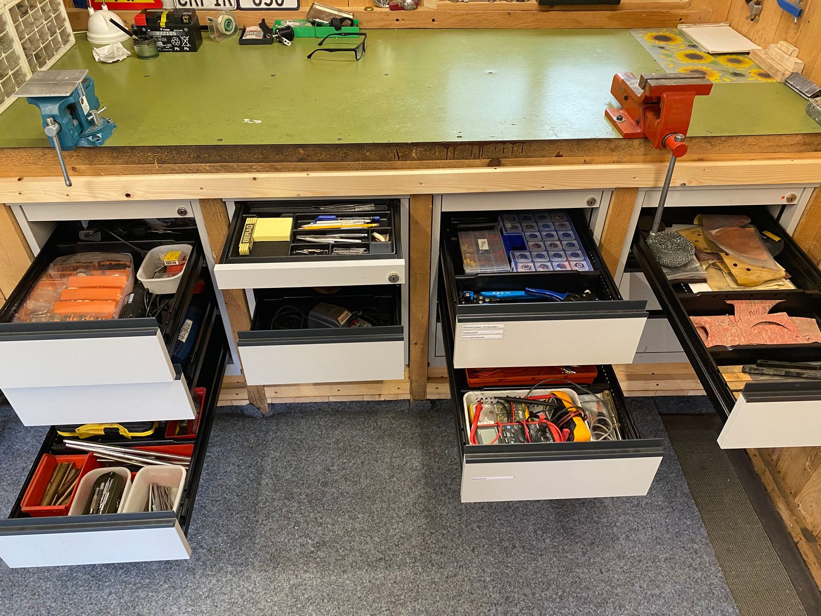 Meine kleine Schrauberbude hat vor dem Winter in Form von vier Korpussen mit Vollauszugschubladen aus Metall nun auch noch das letzte update bekommen. Vieles wurde noch neu sortiert oder weggeschmissen, danach neu eingeräumt und überall (auch im Aussenbereich) habe ich einen gebrauchten grauen Rasenteppich verlegt :P. Ein 32" Curved-Monitor lag auch noch rum. Der Rest ist jetzt nur noch Kosmetik.