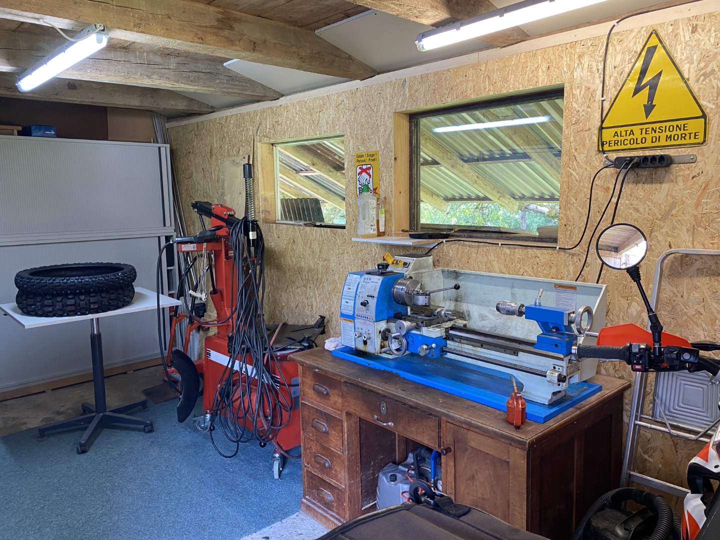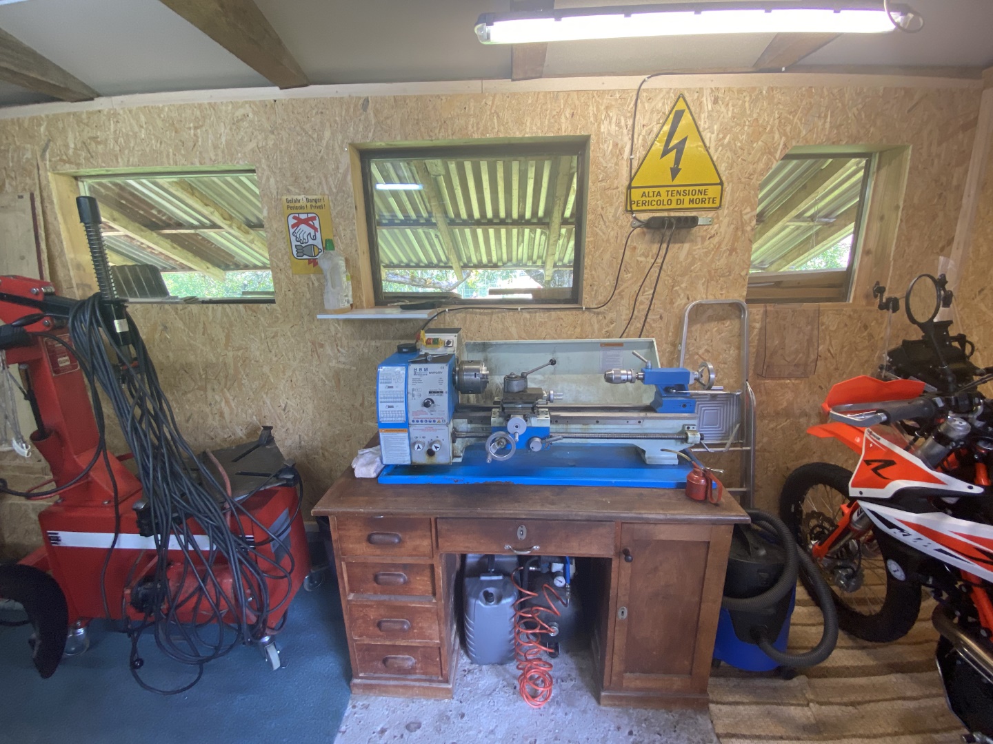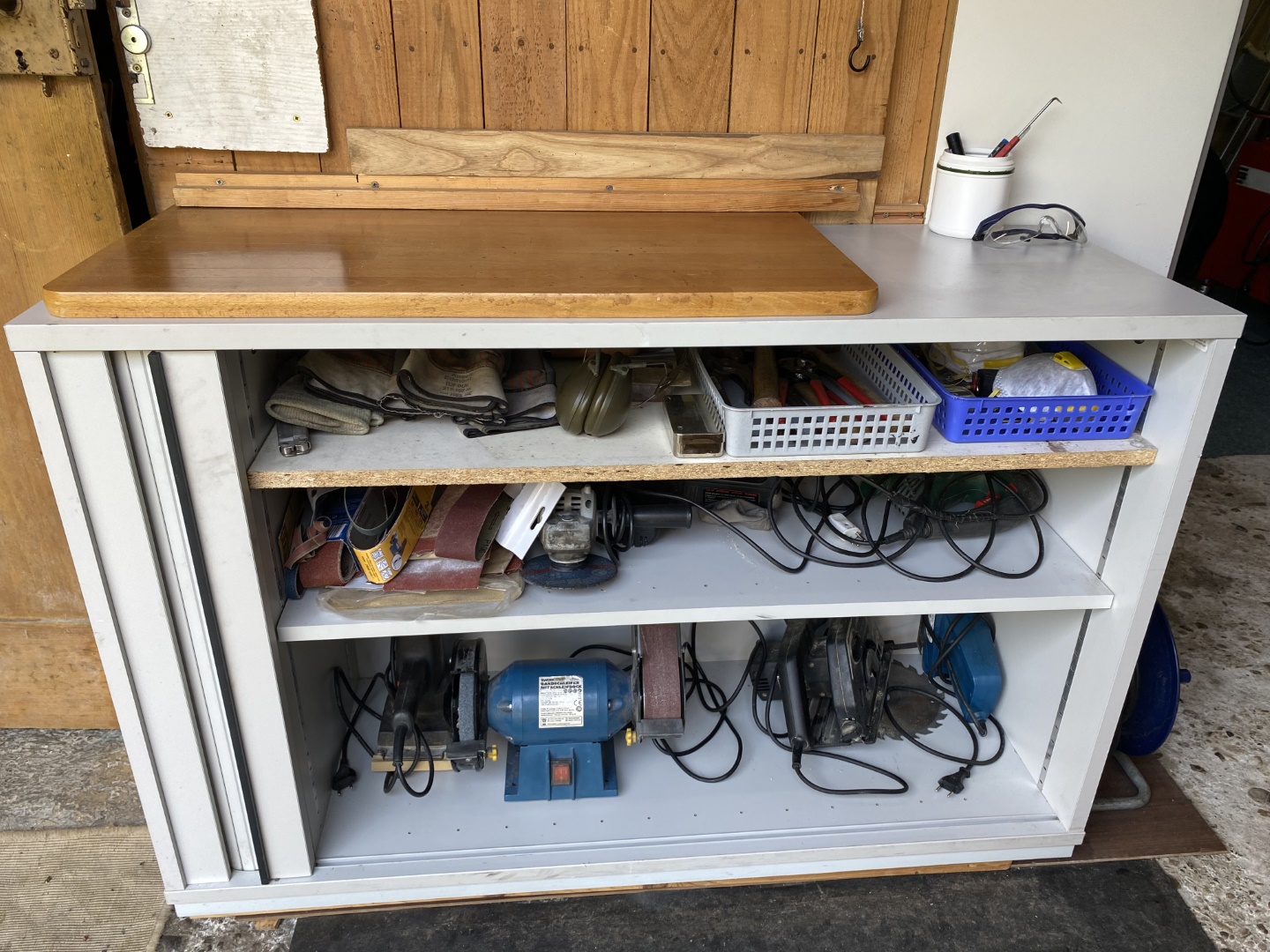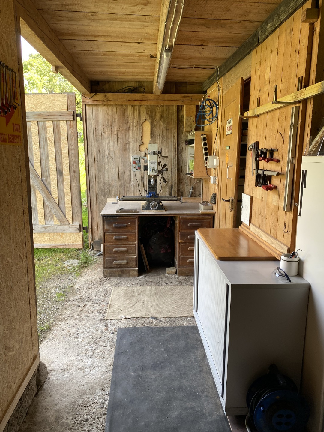 Aber nun zum Aussenbereich: auf einem alten Schreibtisch steht die Bohr- Fräsmaschine. Daneben ein Schiebetürschrank mit diversen Maschinen: