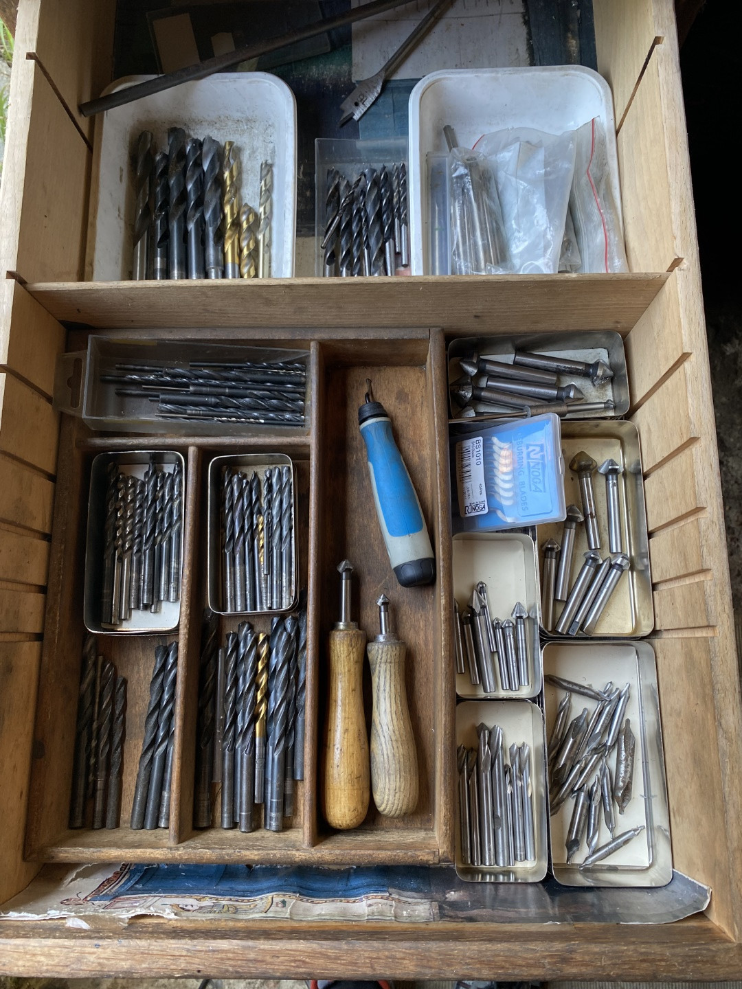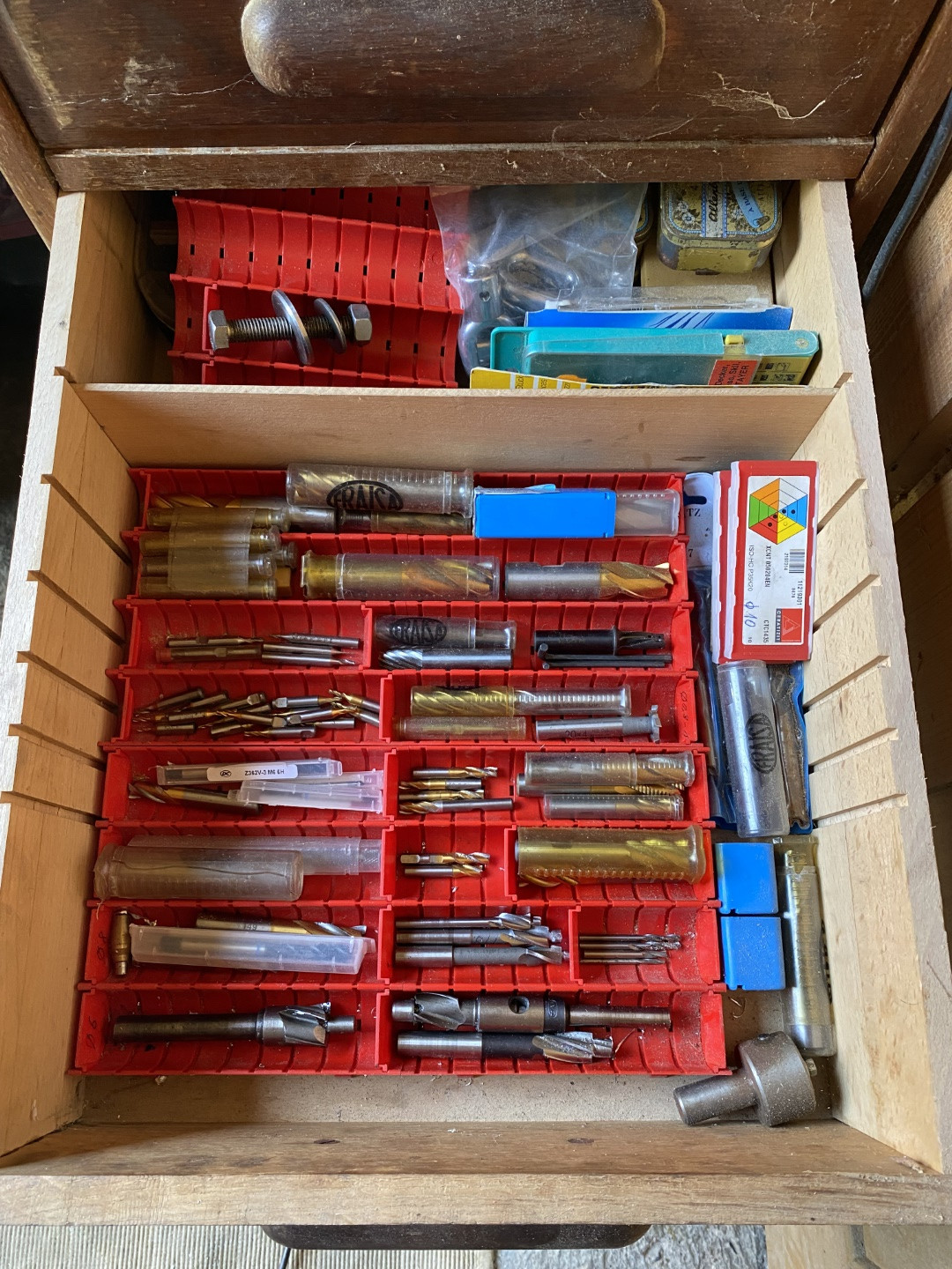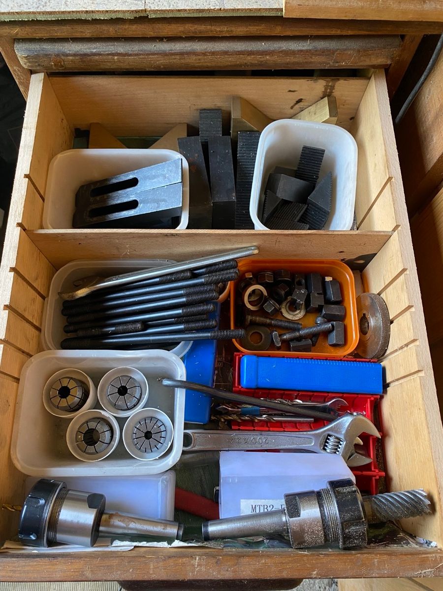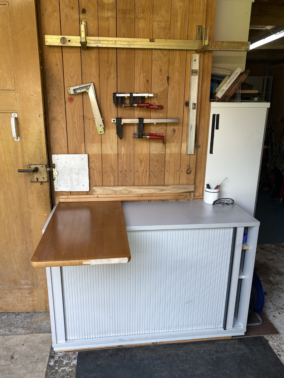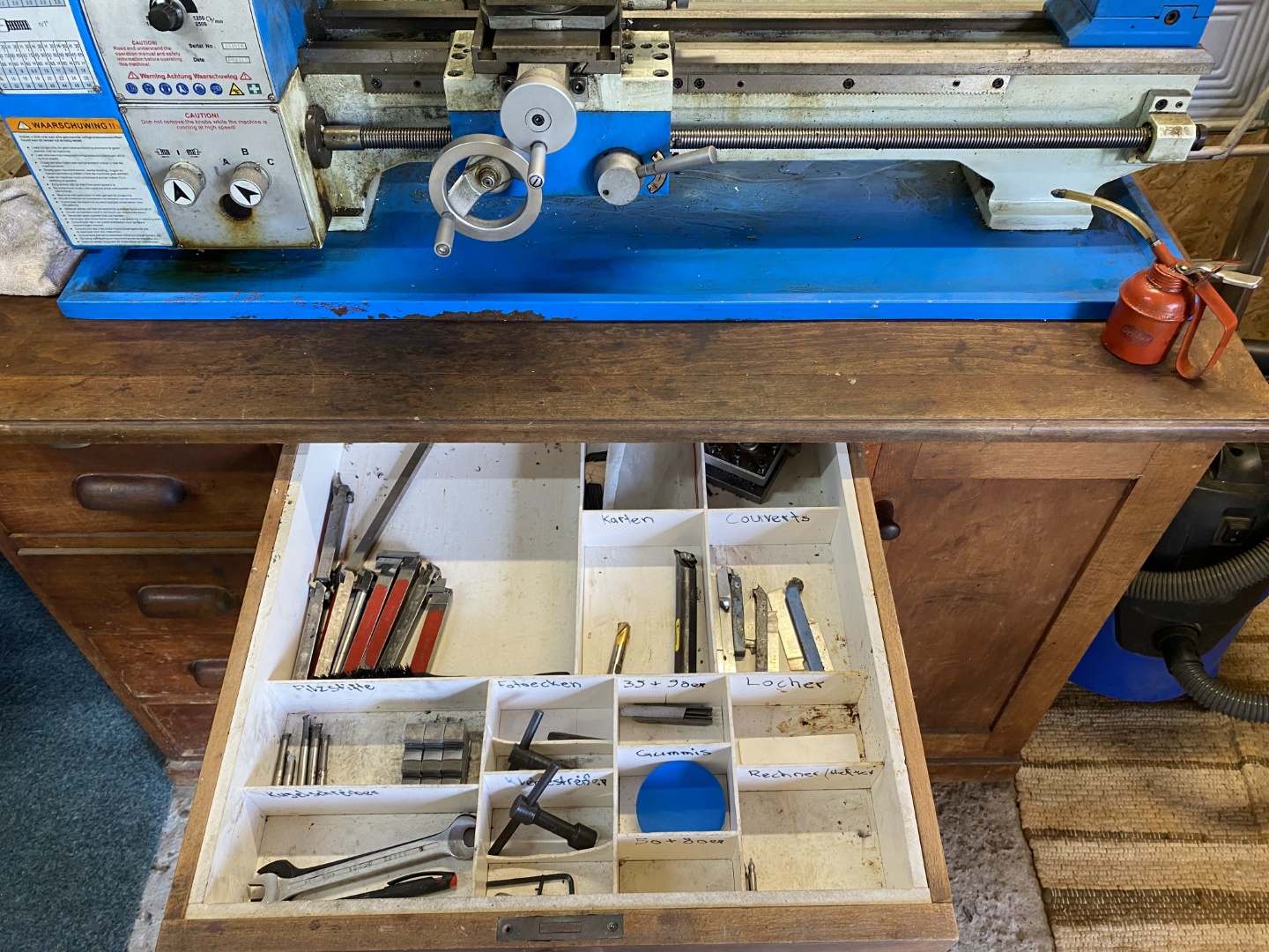 Aber nun zum Aussenbereich: auf einem alten Schreibtisch steht die Bohr- Fräsmaschine. Daneben ein Schiebetürschrank mit diversen Maschinen: