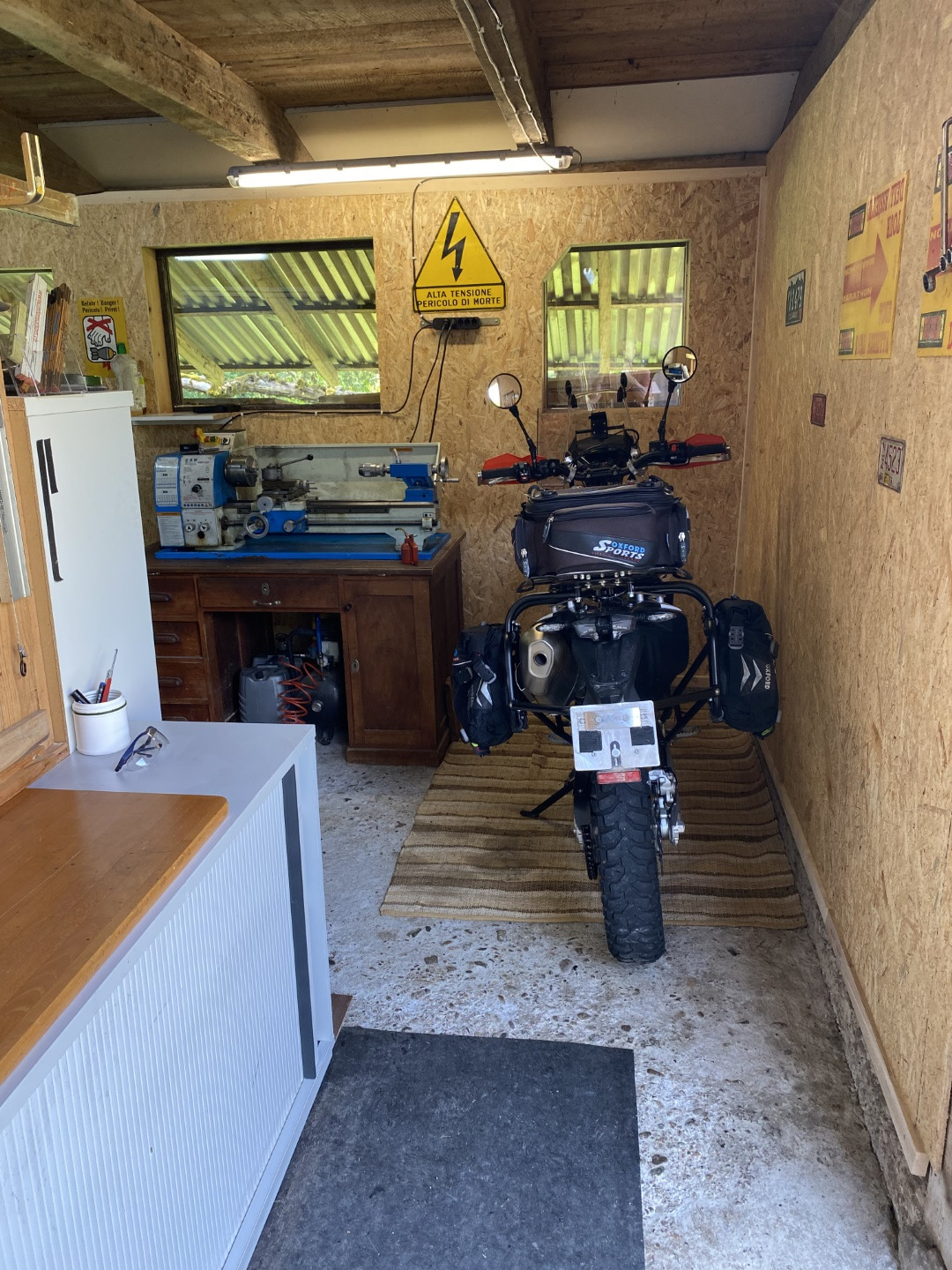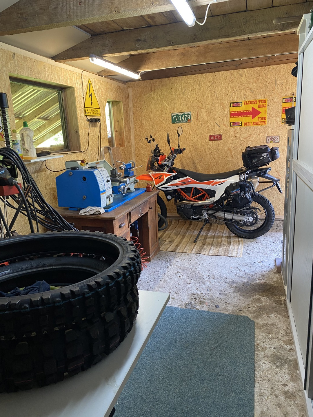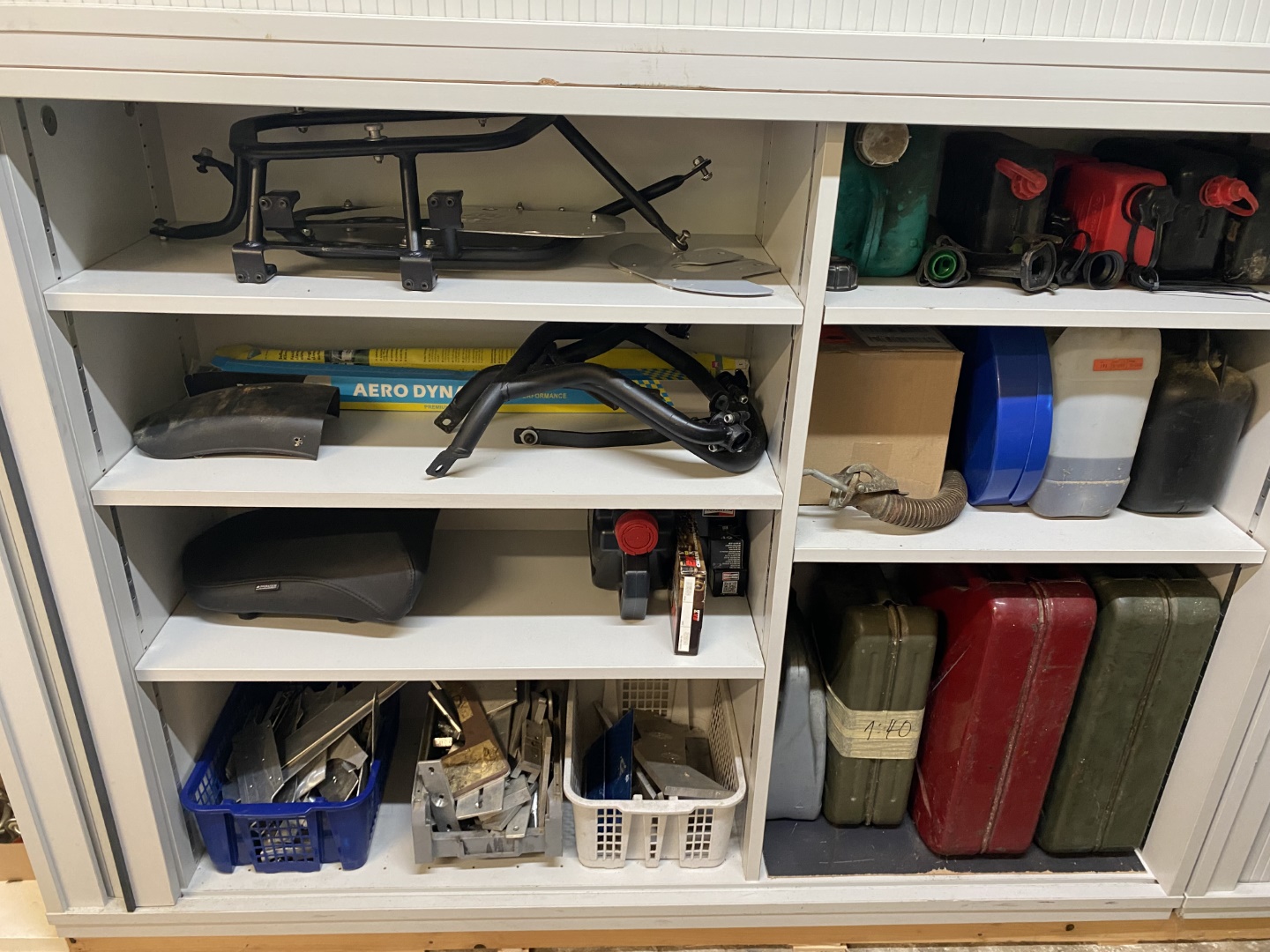#67 Alles anzeigenIm «Aussenbereich» ist der Maschinenbereich. Dort kann ich bohren, fräsen, drehen, schweissen, schleifen, es ist ein zweiter Kompressor, eine Reifenmontiermaschine und eine Wuchtmaschine vorhanden. Diesen «Aussenbereich» bringe ich derzeit auf Vordermann; es gibt noch einiges zu tun und deshalb derzeit noch kein Bild davon. Sieben weitere Schiebetürschränke wie auf dem Bild sind aber bereits installiert.