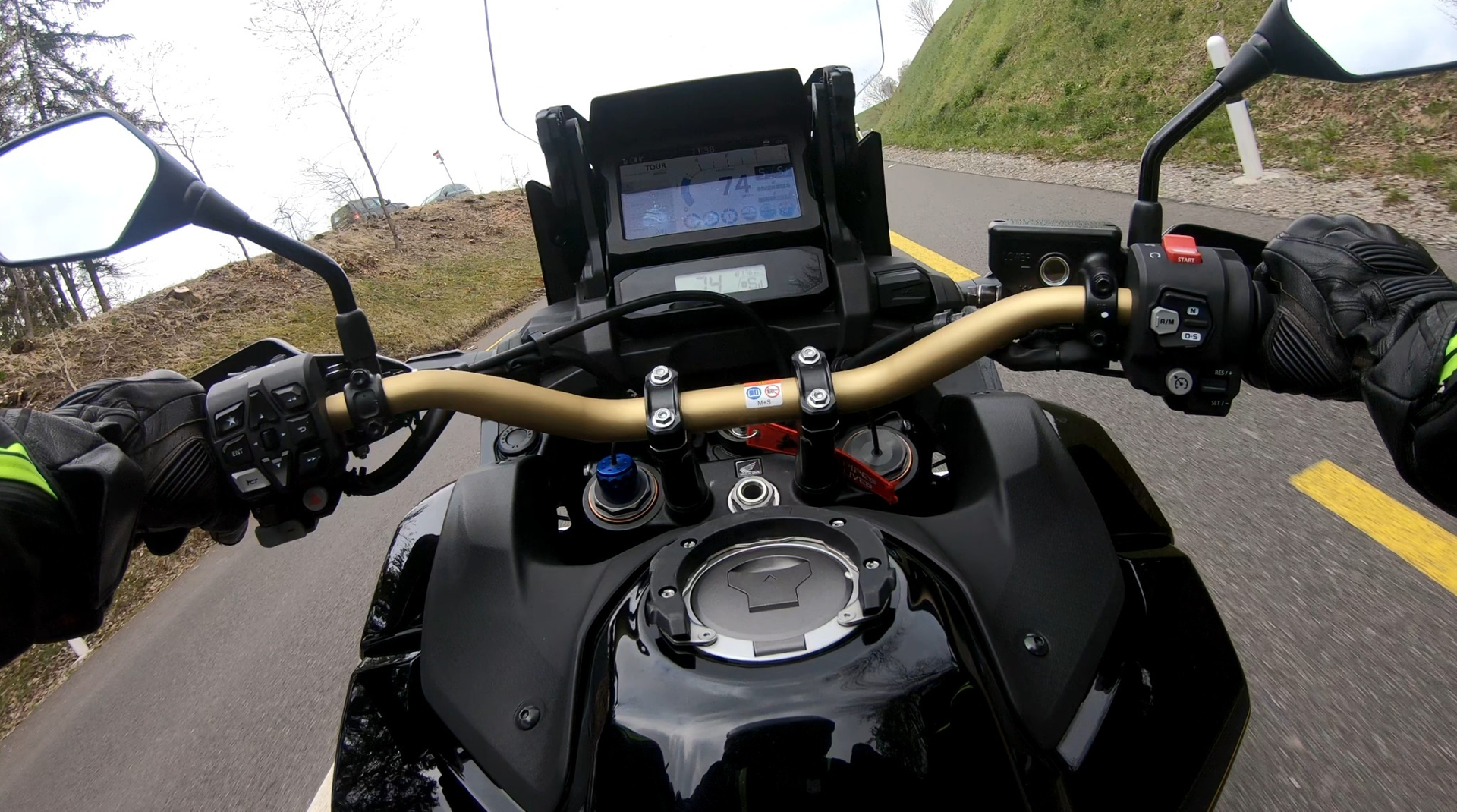 In der Vergangenheit habe ich meine GoPro jeweils mit einem Gurt auf der Höhe des Brustbeins getragen, hat bei meinem früheren Bike wunderbare Bilder gegeben, jetzt mit dem Original Windschild auf zweitunterster Position werden die Bilder nicht so toll: