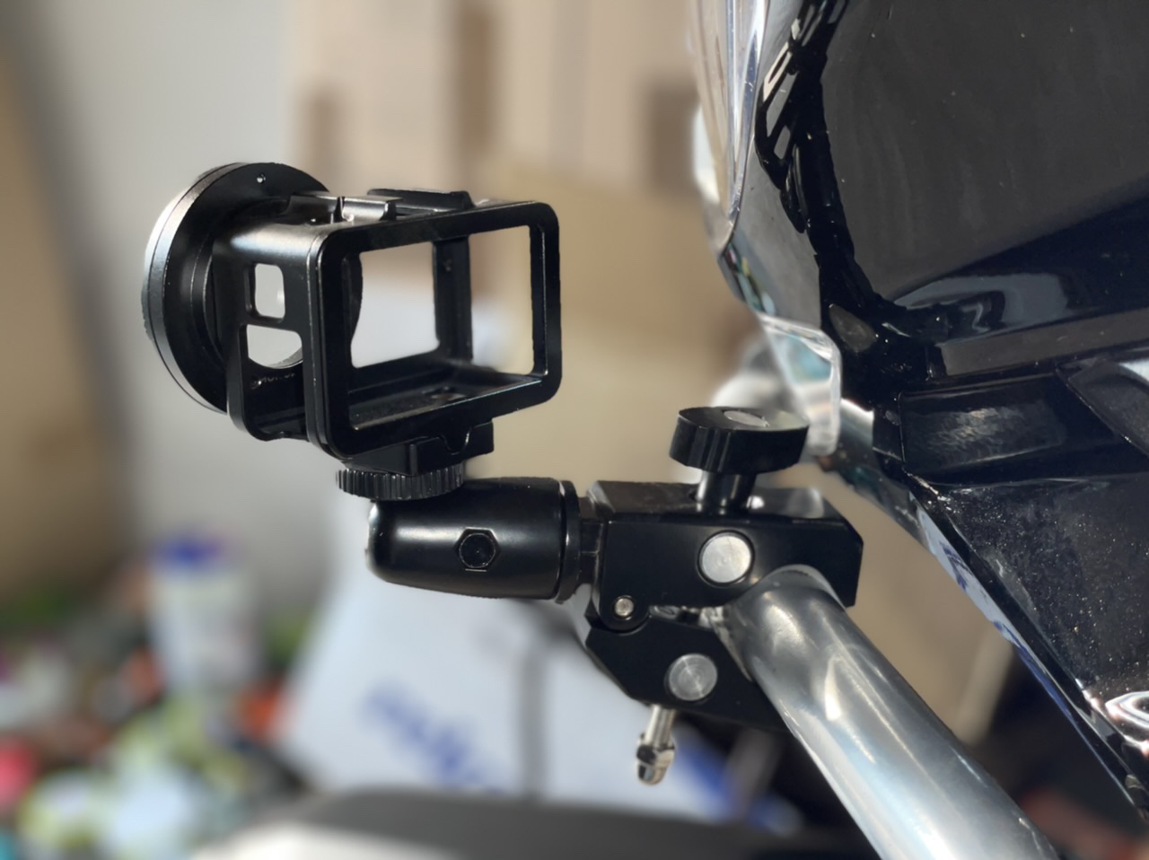 - Positionierung auf dem linken Seitenkoffer mittels J-Adapter (Sichtfeld durch Fahrer und Bike beeinträchtigt, Filmen nur mit Seitenkoffer möglich)
