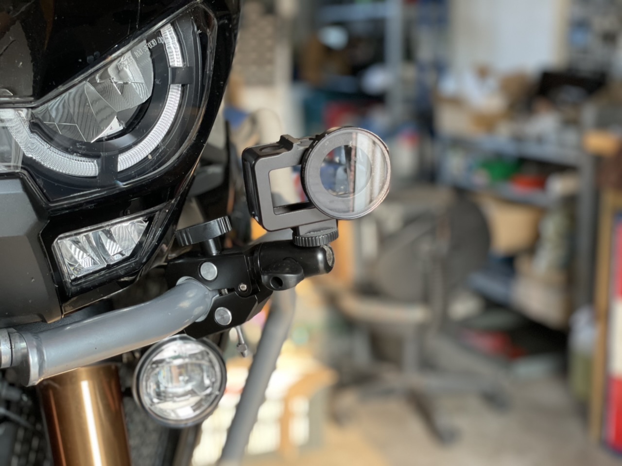 Über dem Blinker ergibt sich eine Art Podest auf dem Dashboard, das reicht aus um ein 3M Klebepad für die verlinkte Gopro Halterung zu befestigen. Damit schwebt die Kamera außen über dem Blinker und kann perfekt mit Strom versorgt werden!