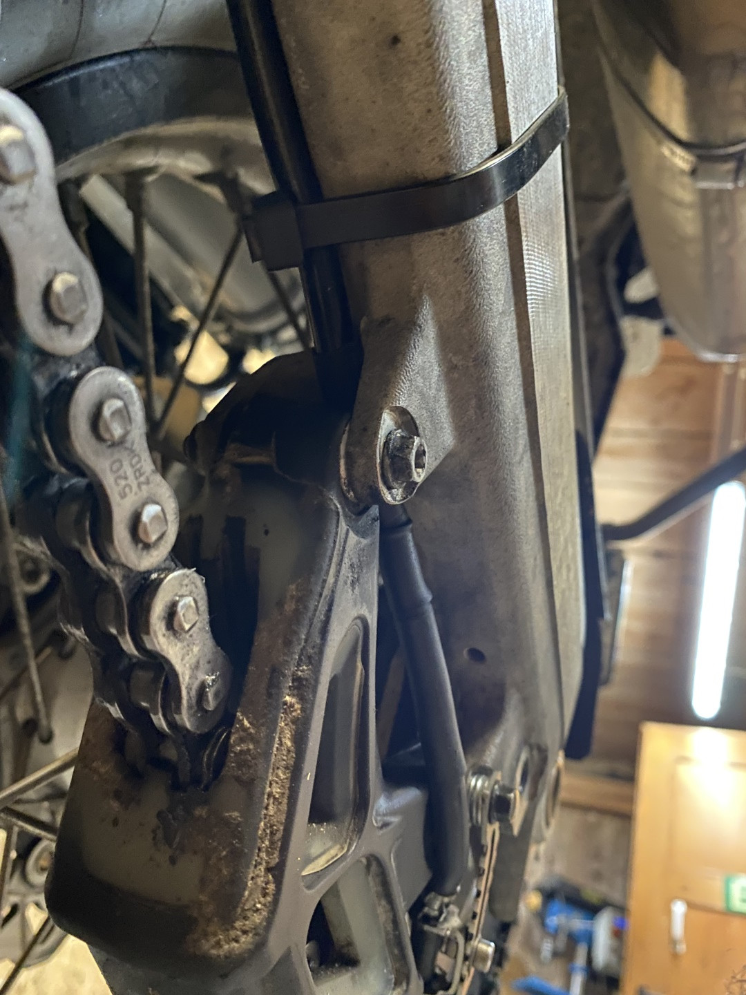 Durch die Position der Düsennadel auf der Außenseite des Kettenblatts, wird die äußere Seite der Kette natürlich etwas stärker benetzt. Dies zeigt sich neben dem stärkeren Glanz der äußeren Kettenglieder, auch am Tragbild der Kettenrollen. Der Kettensatz wurde etwa zur selben Zeit gewechselt, in welcher mein Nemo2 gegen den OneOne getauscht wurde. Daher lassen sich diese Details recht gut erkennen.