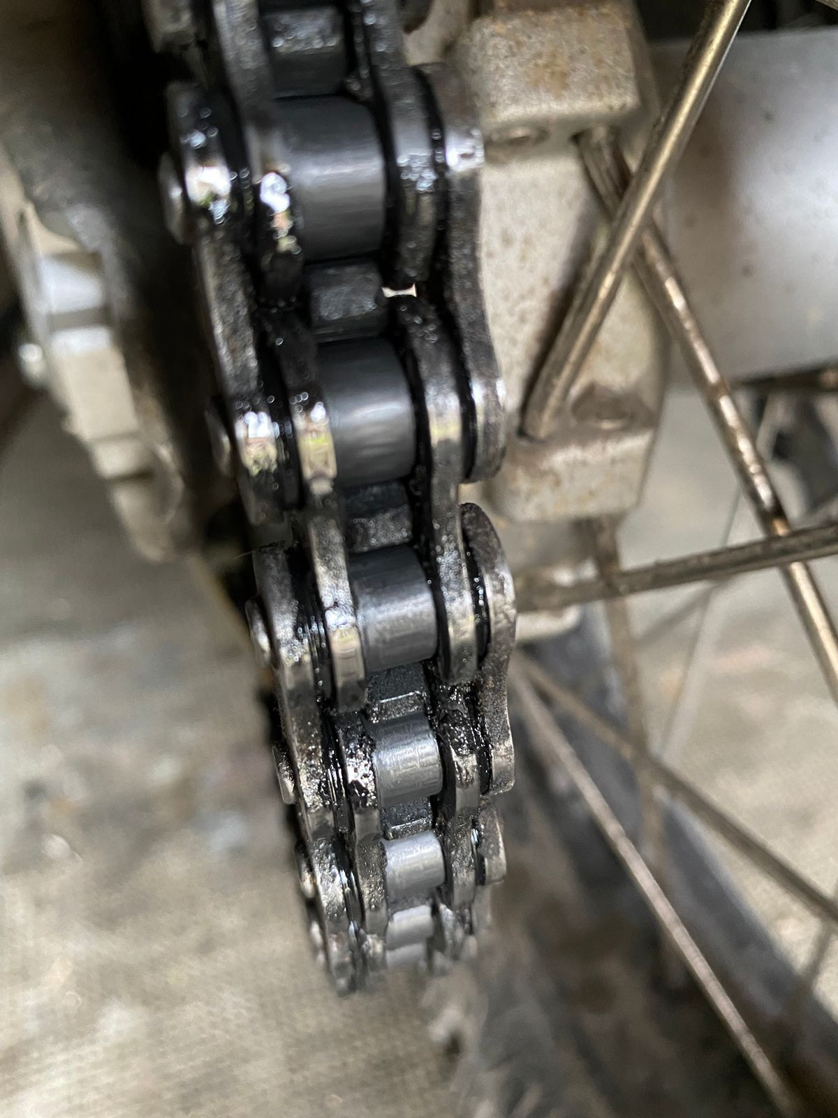 #112 Heute die KTM etwa 150km im Mischbetrieb (schmale Strässchen, Schotter) bewegt. Vor der ersten Fahrt mit dem OneOne die Kette vom Schmodder befreit und mit einem Lappen gereinigt; dann bei der Wegfahrt 1x betätigt und am Schluss 2km vor dem abstellen in der 50er Zone 1x betätigt. Die Drossel ist 3/4 Umdrehung offen.
