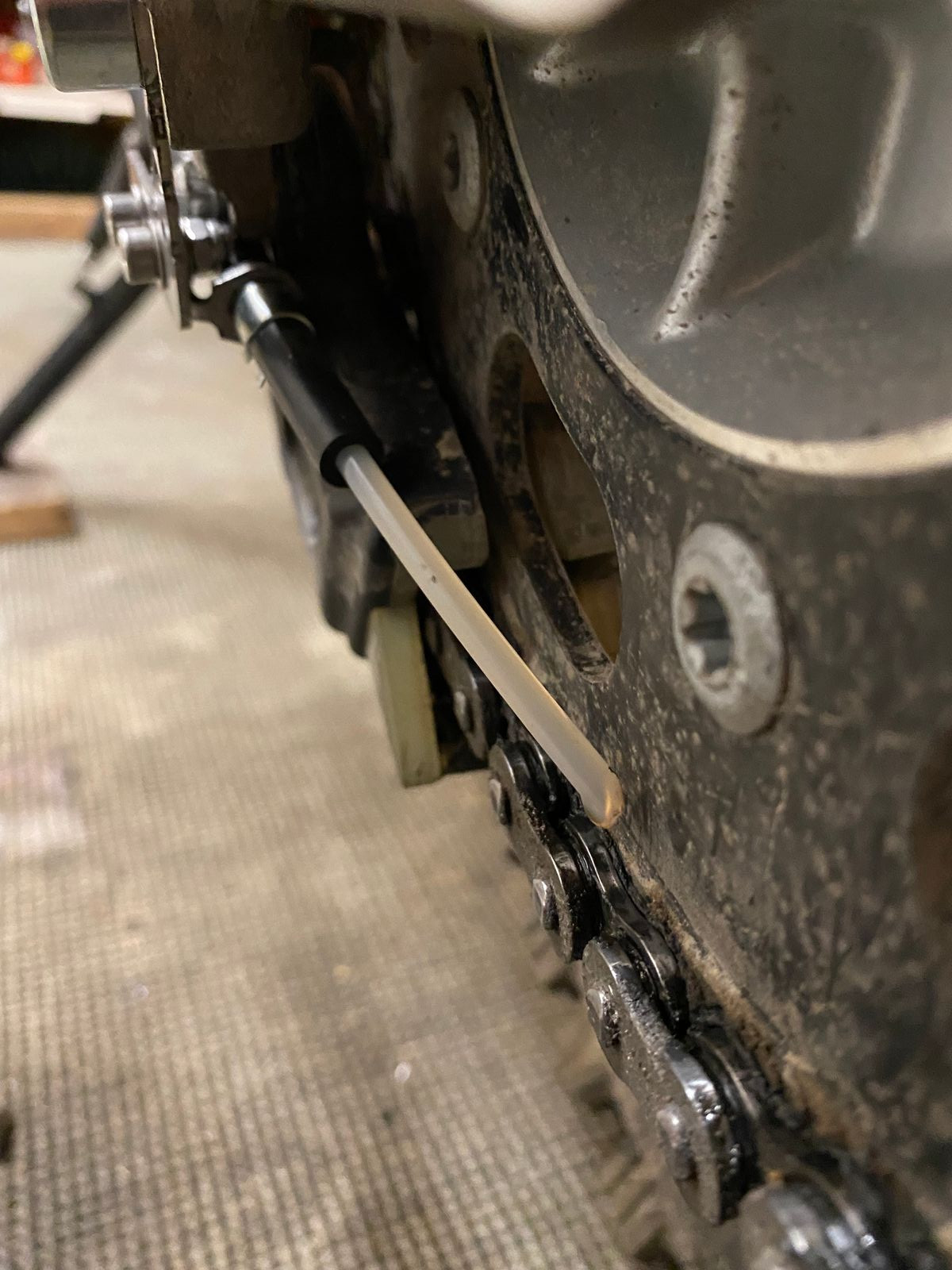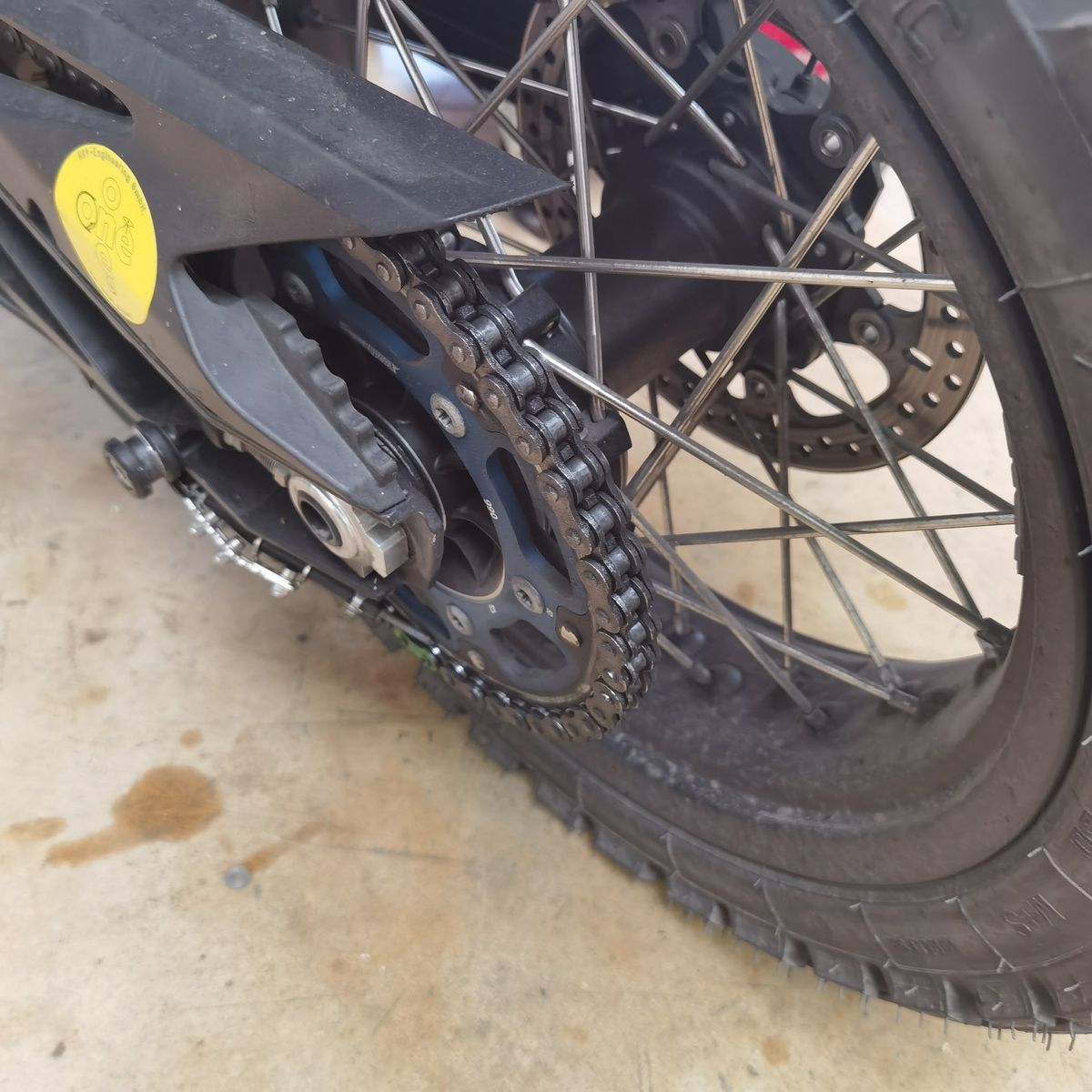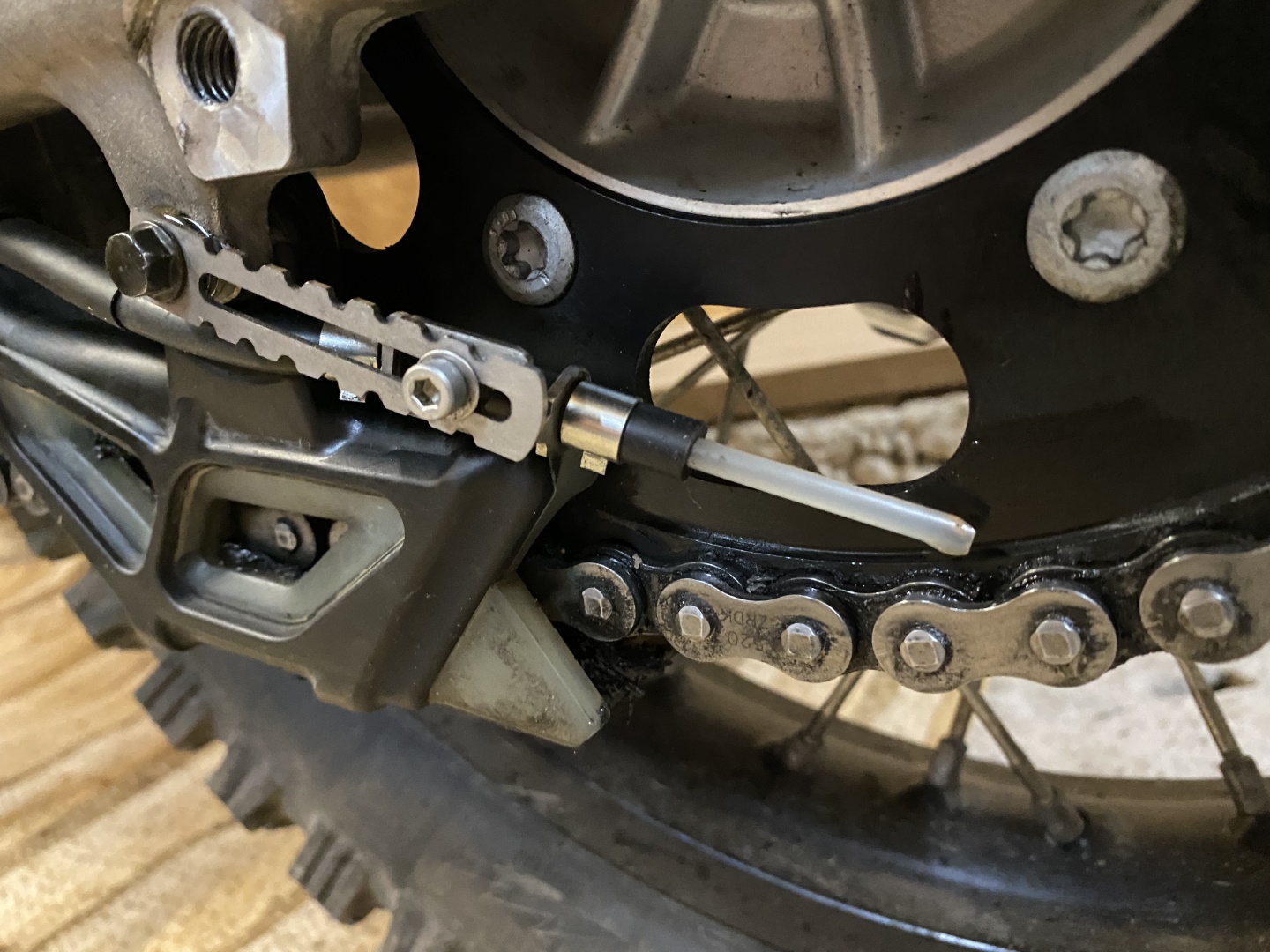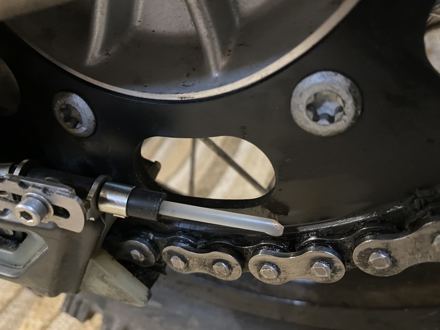 Durch die Position der Düsennadel auf der Außenseite des Kettenblatts, wird die äußere Seite der Kette natürlich etwas stärker benetzt. Dies zeigt sich neben dem stärkeren Glanz der äußeren Kettenglieder, auch am Tragbild der Kettenrollen. Der Kettensatz wurde etwa zur selben Zeit gewechselt, in welcher mein Nemo2 gegen den OneOne getauscht wurde. Daher lassen sich diese Details recht gut erkennen.