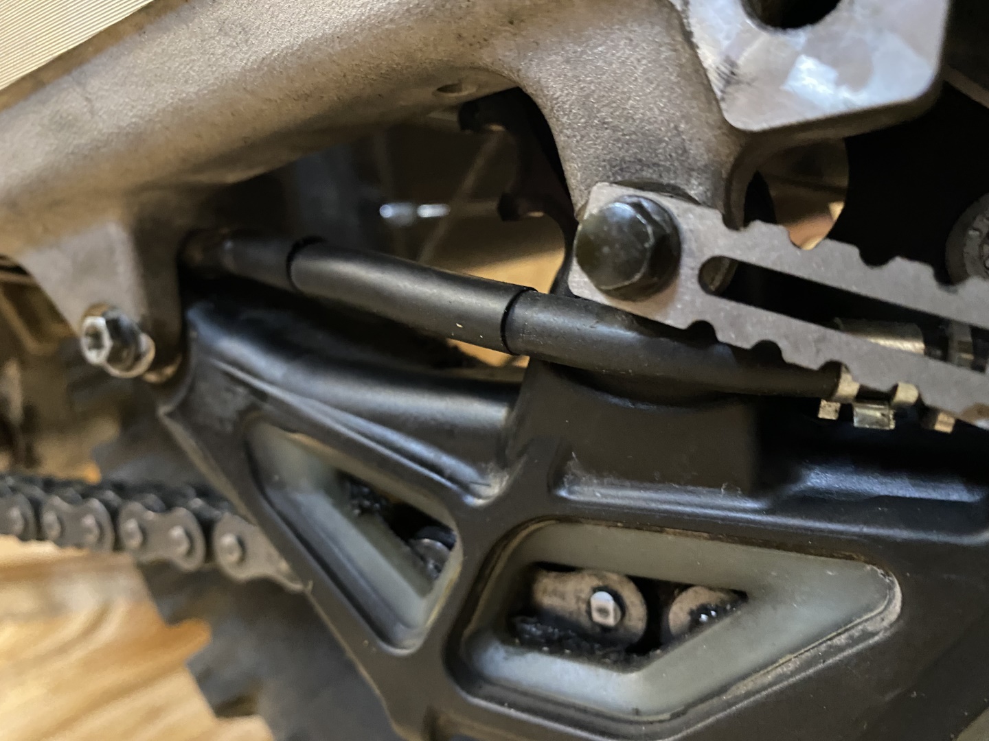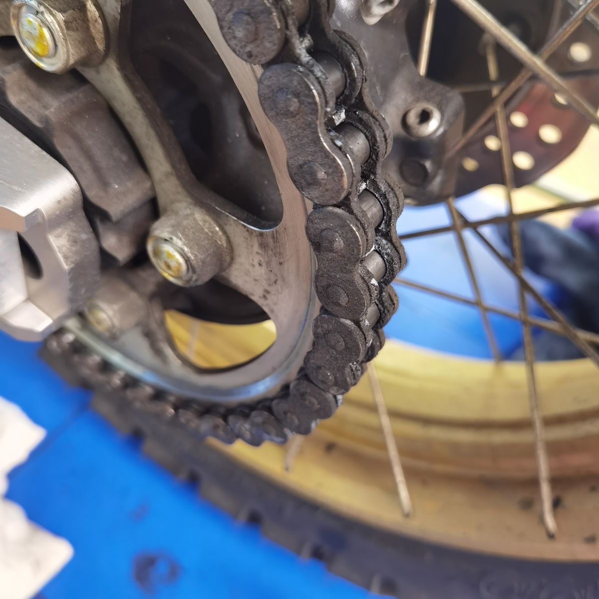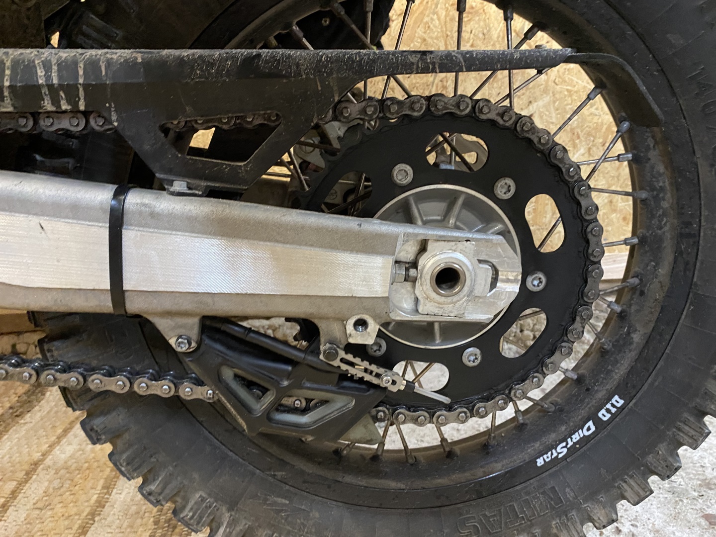 Durch die Position der Düsennadel auf der Außenseite des Kettenblatts, wird die äußere Seite der Kette natürlich etwas stärker benetzt. Dies zeigt sich neben dem stärkeren Glanz der äußeren Kettenglieder, auch am Tragbild der Kettenrollen. Der Kettensatz wurde etwa zur selben Zeit gewechselt, in welcher mein Nemo2 gegen den OneOne getauscht wurde. Daher lassen sich diese Details recht gut erkennen.