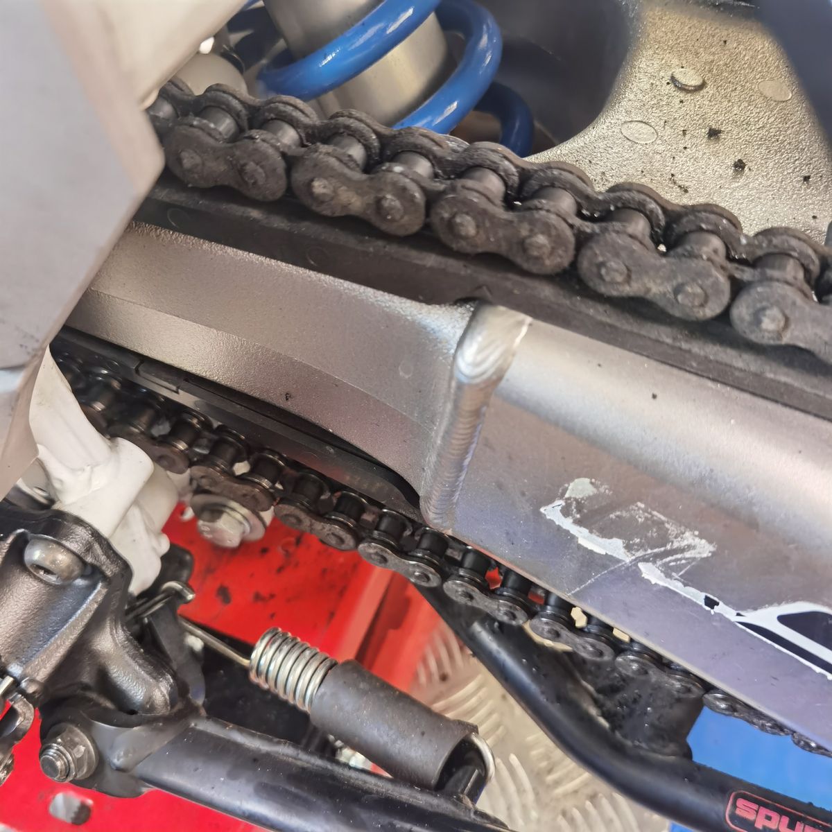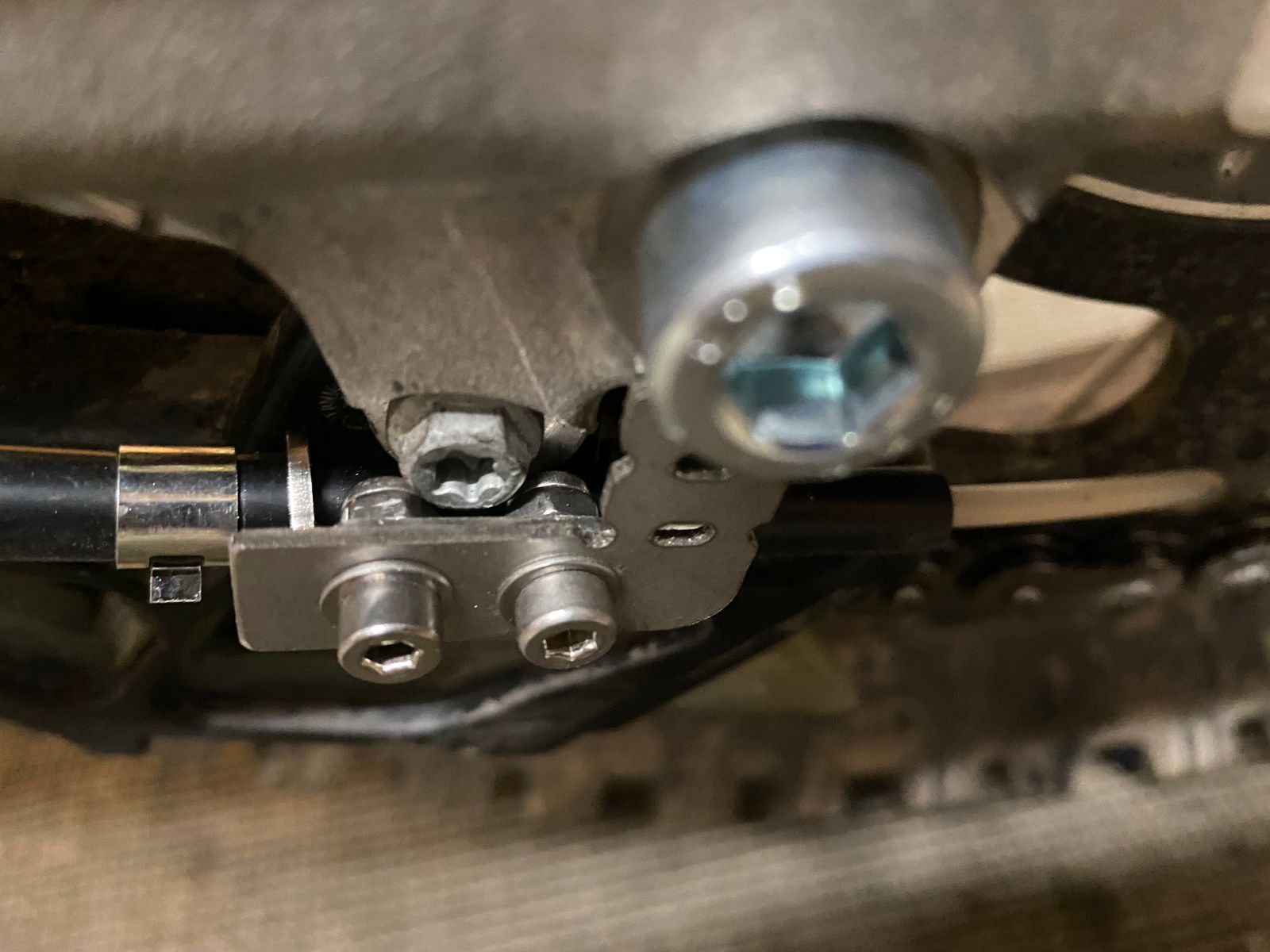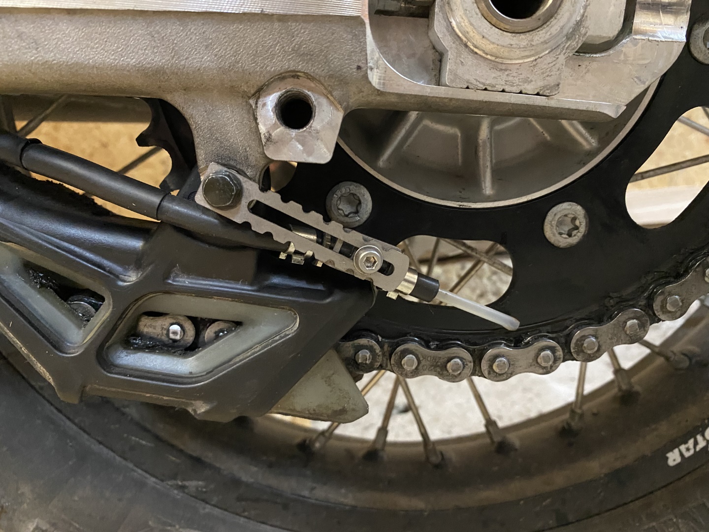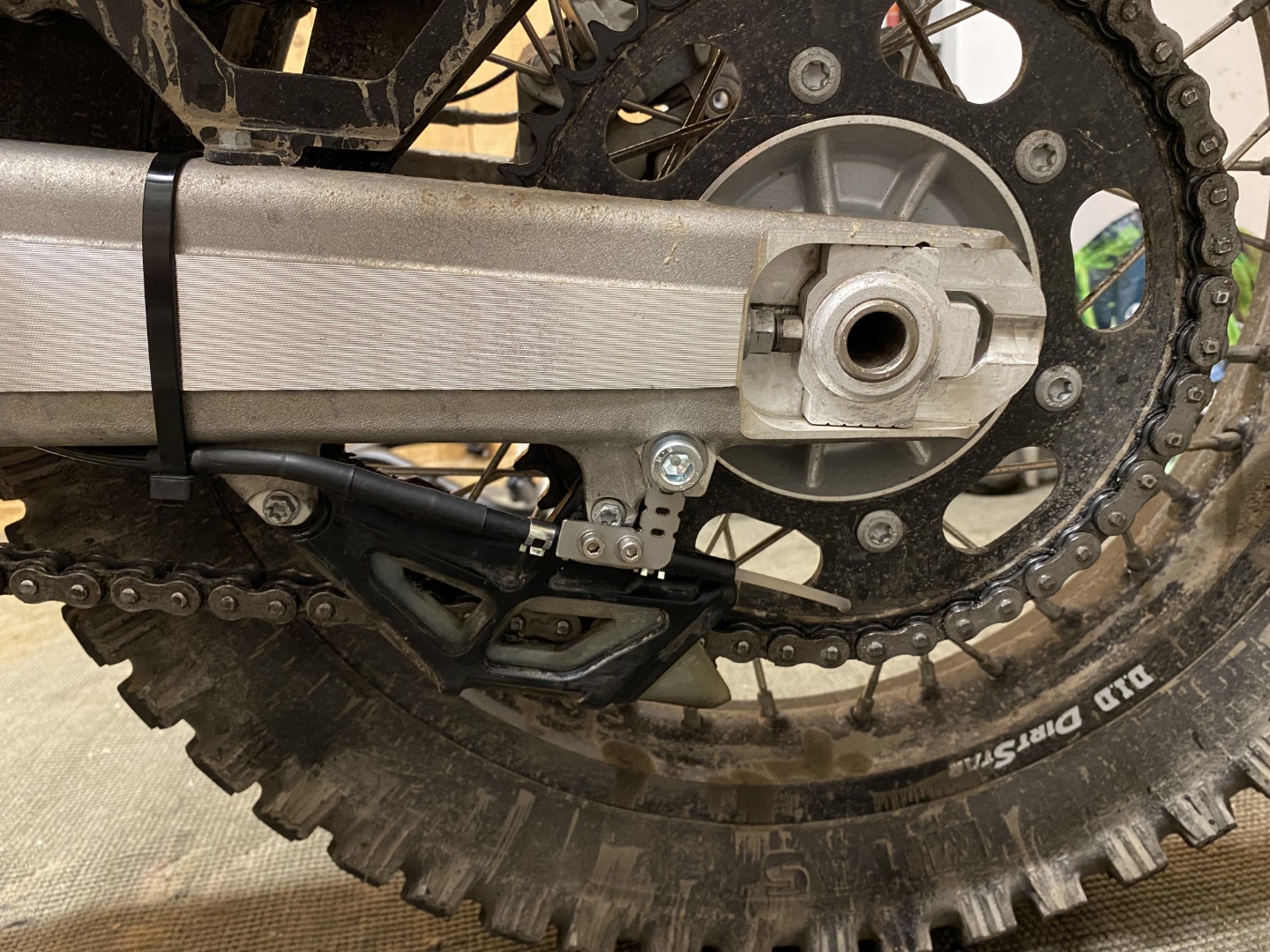 Durch die Position der Düsennadel auf der Außenseite des Kettenblatts, wird die äußere Seite der Kette natürlich etwas stärker benetzt. Dies zeigt sich neben dem stärkeren Glanz der äußeren Kettenglieder, auch am Tragbild der Kettenrollen. Der Kettensatz wurde etwa zur selben Zeit gewechselt, in welcher mein Nemo2 gegen den OneOne getauscht wurde. Daher lassen sich diese Details recht gut erkennen.