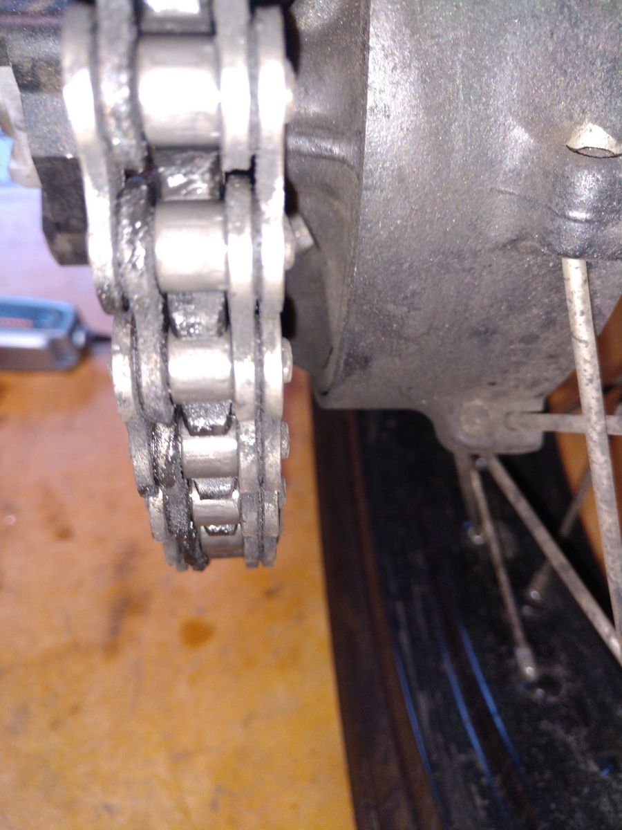 Die Bilder zeigen meine Africa. Ungewaschen seit letzten Oktober. Scusi. Hab etwas gar viel am Nippelchen gezupft, deshalb der etwas ölige Eindruck. Beachtet mal die Innenseite. sind da ganz wenige Laufspuren vom Öl. Aber immer noch zu wenig um die O-Ringe und die Aussenlaschen feucht schimmernd benetzen. Die leichte Rostbildung nach der letzten Regenfahrt erkennt man schon. Das Blatt wurde vor den Bohrungen gereinigt.