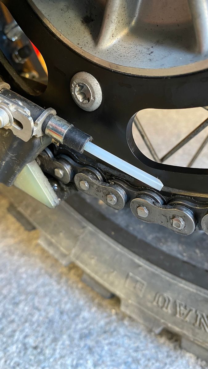 Natürlich werden Lager und Kette nicht gedampft; soll heissen: die Kette bekommt keinerlei sonstige Pflegemassnahmen ausser dem Öler und dem Blick drauf nach der Tour. Die Kette habe ich bisher auf der Gesamtdistanz 1/6 Umdrehung nachgespannt (praktisch mit der Sechskantschraube analog der Africa Twin). Bei einem Kettenspanner mit M8 Gewinde entspricht dies 0.2mm in der Länge.