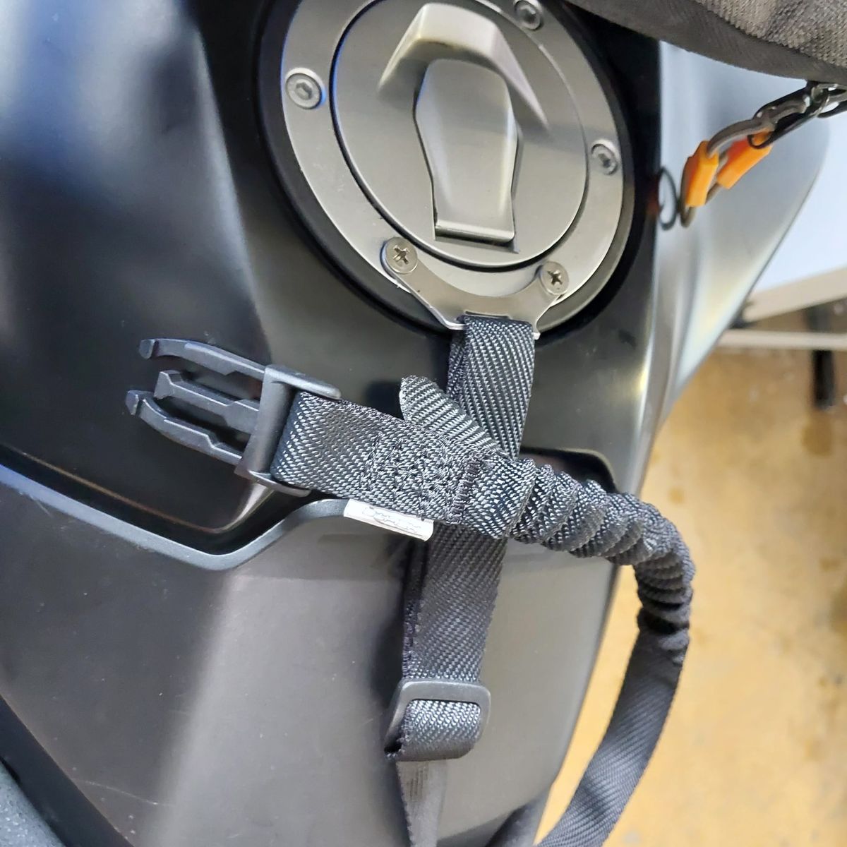 Einen Zugtest am Riemen bis zum Verschieben auf dem Seitenständer nach hinten hat die dicke Honda schon problemlos hinter sich. Ich lass es mal drauf ankommen und hoffe insgeheim dass ich es nie austesten muss. Vertraue ja auch dem Klickverschluss aus K-Stoff...