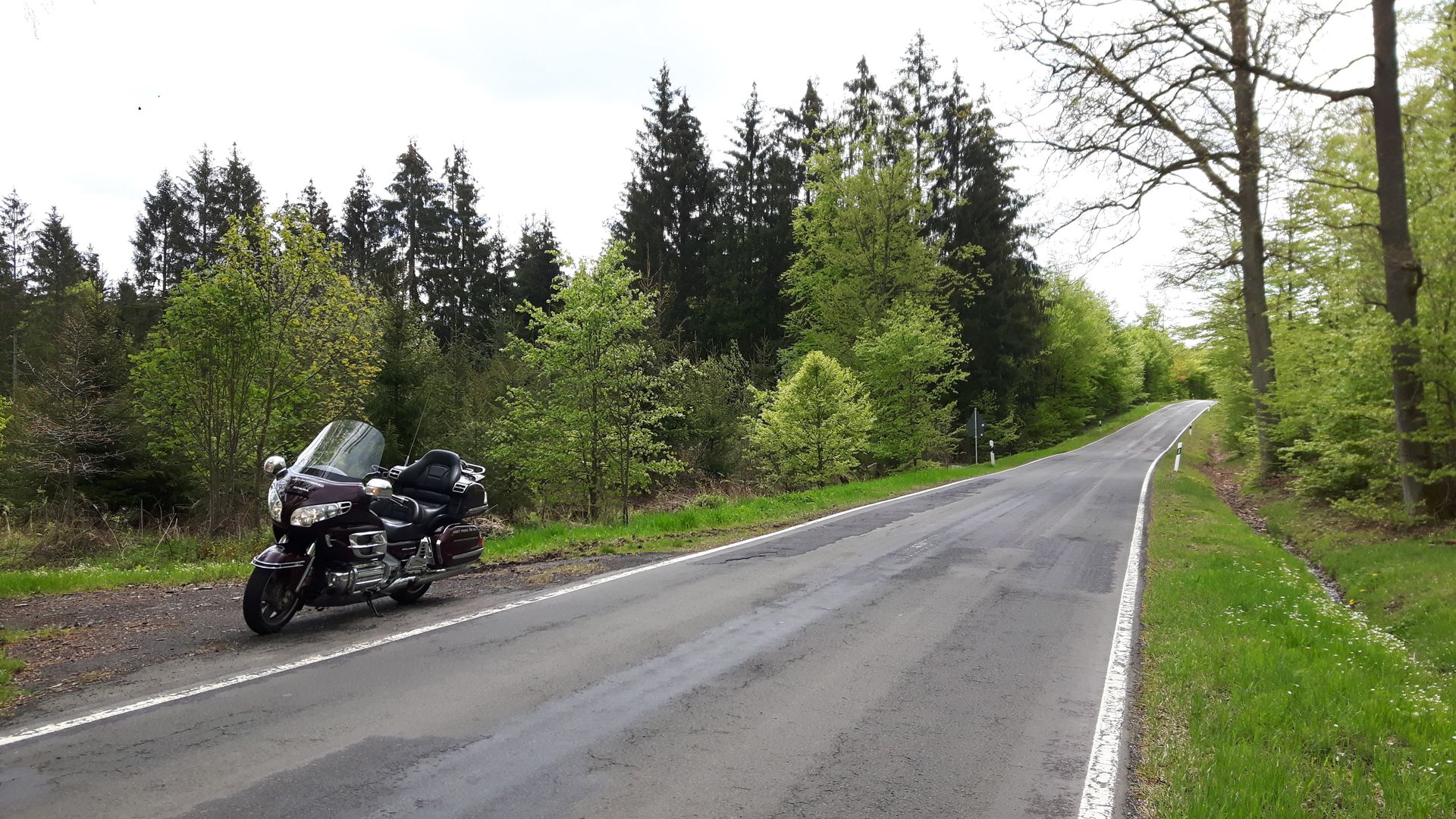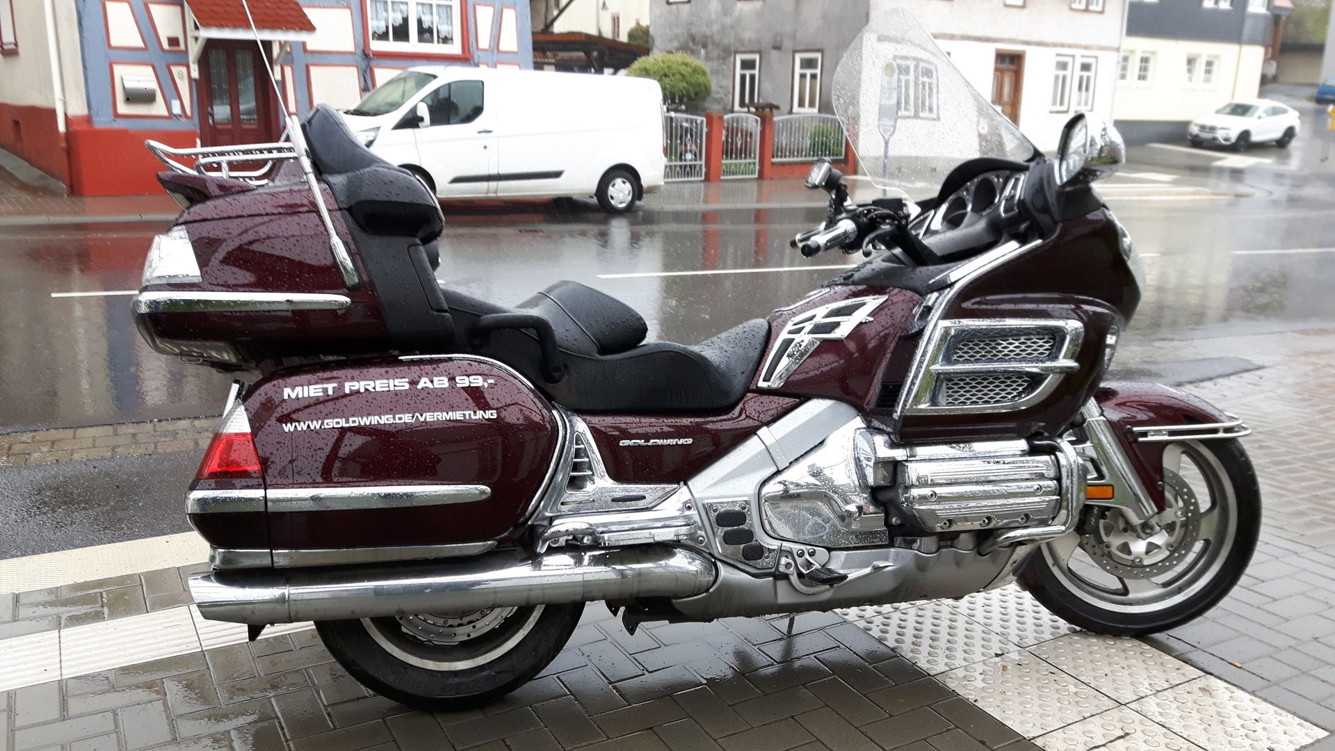 Ich hatte mir bei Fa Fuchs in Uslar eine Gold Wing GL 1800 SC 47 von Freitag nachmttag bis Montag vormittag gemietet. Die chromglänzende Wuchtbrumme stand bereit und ich wurde kurz in die 57 Knöpfe und Schalter eingeweiht. Mit Blick auf meinen Erwin meinte er nur "Du wirst aufsetzen, aber das sind nur die Fußrasten, kein Problem". Dann hieß es umladen und Erwin verlassen.