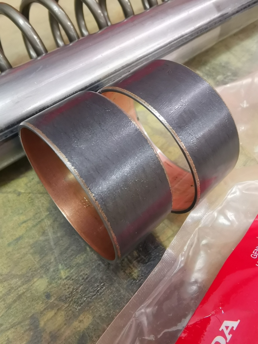 Hier noch ein Foto vom rechten Standrohr, mit der beschädigten Oberfläche. Diese ist vorne am Standrohr, wo auch der grössere Druck beim einfedern ist. Und noch ein Foto von der Gleitfläche die ok ist, links neu, rechts gebraucht 50 000 Km
